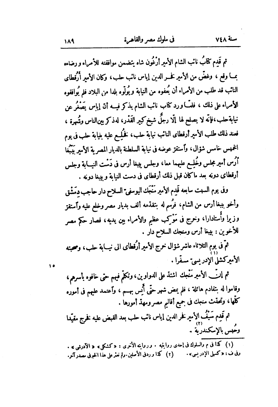 ثم قدم كتاب نائب الشام الأمير أرغون شاه يتضمن موافقته للأمراء ورضاءه بما وقع، وغضّ من الأمير فخر الدين إياس نائب حلب، وكان الأمير أرقطاى النائب قد طلب من الأمراء أن يعفوه من النيابة ويولّوه بلدا من البلاد فلم يوافقوه الأمراء على ذلك، فلمّا ورد كتاب نائب الشام يذكر فيه أنّ إياس يصغر عن نيابة حلب، فإنّه لا يصلح لها إلّا رجل شيخ كبير القدر، له ذكر بين الناس وشهرة، فعند ذلك طلب الأمير أرقطاى النائب نيابة حلب، فخلع عليه بنيابة حلب فى يوم الخميس خامس شوّال، واستقرّ عوضه فى نيابة السلطنة بالديار المصرية الأمير بيبغا أرس أمير مجلس وخلع عليهما معا، وجلس بيبغا أرس فى دست النيابة وجلس أرقطاى دونه بعد ما كان قبل ذلك أرقطاى فى دست النيابة وبيبغا دونه.