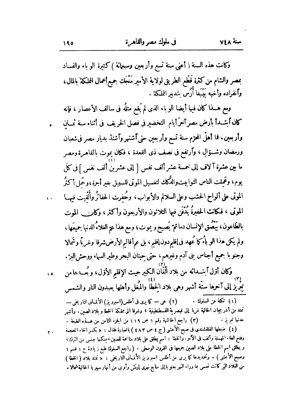 ومع هذا كان فيها أيضا الوباء الذي لم يقع مثله فى سالف الأعصار، فإنه كان ابتدأ بأرض مصر آخر أيام التخضير فى فصل الخريف فى أثناء سنة ثمان وأربعين، فما أهلّ المحرّم سنة تسع وأربعين حتى اشتهر واشتدّ بديار مصر فى شعبان ورمضان وشوّال، وارتفع فى نصف ذى القعدة، فكان يموت بالقاهرة ومصر ما بين عشرة آلاف إلى خمسة عشر ألف نفس [إلى عشرين «1» ألف نفس] فى كلّ يوم، وعملت الناس التوابيت والدّكك لتغسيل الموتى للسبيل بغير أجرة، وحمل أكثر الموتى على ألواح الخشب وعلى السلالم والأبواب، وحفرت الحفائر وألقيت فيها الموتى، فكانت الحفيرة يدفن فيها الثلاثون والأربعون وأكثر، وكان الموت بالطّاعون، يبصق الإنسان دما ثمّ يصيح ويموت؛ ومع هذا عمّ الغلاء الدنيا جميعها، ولم يكن هذا الوباء كما عهد فى إقليم دون إقليم، بل عم أقاليم الأرض شرقا وغربا وشمالا وجنوبا جميع أجناس بنى آدم وغيرهم، حتى حيتان البحر وطير السماء ووحش البرّ.