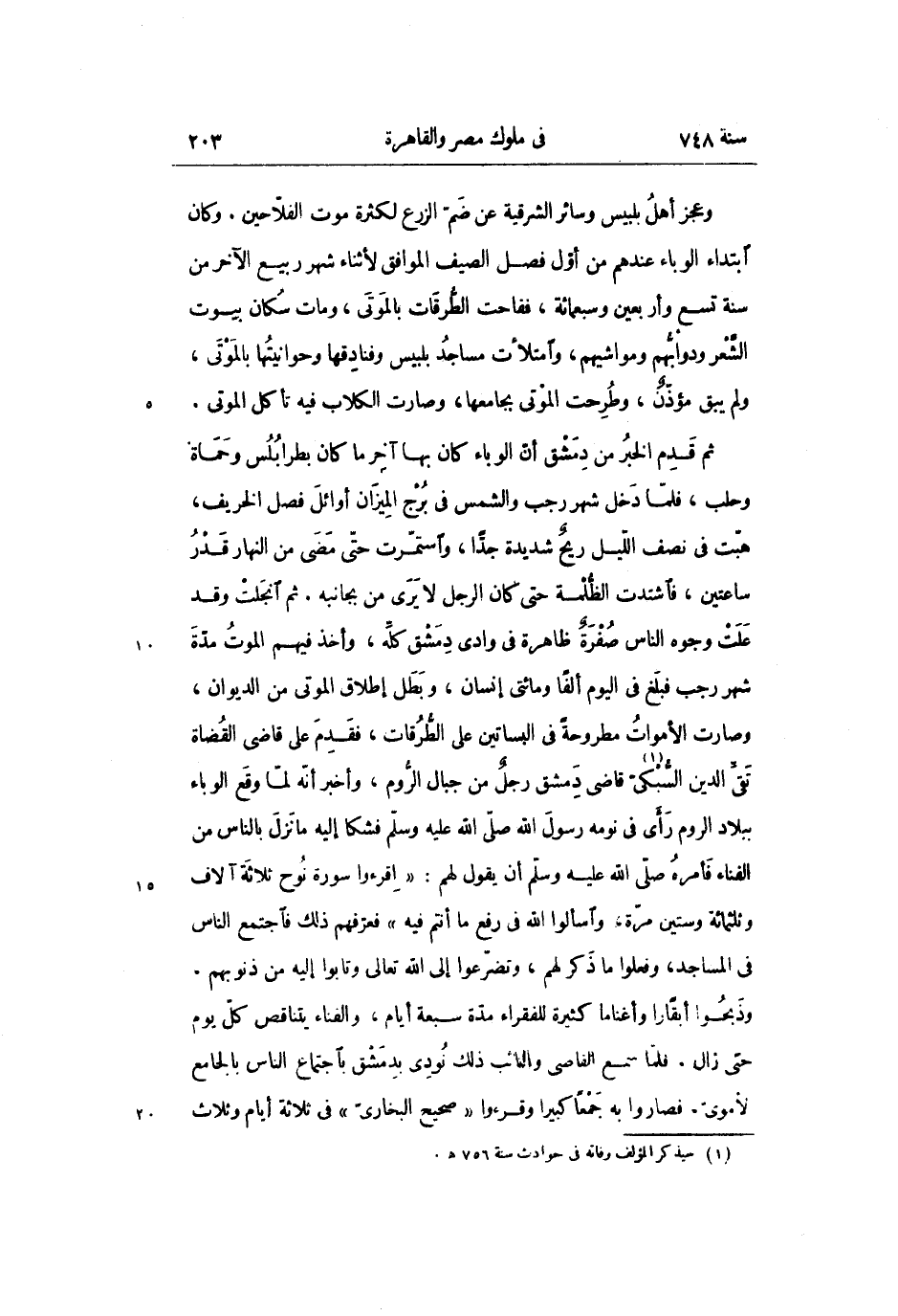 ثم قدم الخبر من دمشق أنّ الوباء كان بها آخر ما كان بطرابلس وحماة وحلب، فلمّا دخل شهر رجب والشمس فى برج الميزان أوائل فصل الخريف، هبّت فى نصف اللّيل ريح شديدة جدّا، واستمرّت حتّى مضى من النهار قدر ساعتين، فاشتدت الظّلمة حتى كان الرجل لا يرى من بجانبه. ثم انجلت وقد علت وجوه الناس صفرة ظاهرة فى وادى دمشق كلّه، وأخذ فيهم الموت مدّة شهر رجب فبلغ فى اليوم ألفا ومائتى إنسان، وبطل إطلاق الموتى من الديوان، وصارت الأموات مطروحة فى البساتين على الطّرقات، فقدم على قاضى القضاة تقىّ الدين السّبكىّ «1» قاضى دمشق رجل من جبال الرّوم، وأخبر أنّه لمّا وقع الوباء ببلاد الروم رأى فى نومه رسول الله صلّى الله عليه وسلّم فشكا إليه ما نزل بالناس من الفناء فأمره صلّى الله عليه وسلّم أن يقول لهم: «اقرءوا سورة نوح ثلاثة آلاف وثلثمائة وستين مرّة، واسألوا الله فى رفع ما أنتم فيه» فعرّفهم ذلك فاجتمع الناس فى المساجد، وفعلوا ما ذكر لهم، وتضرّعوا إلى الله تعالى وتابوا إليه من ذنوبهم، وذبحوا أبقارا وأغناما كثيرة للفقراء مدّة سبعة أيام، والفناء يتناقص كلّ يوم حتى زال. فلمّا سمع القاضى والنائب ذلك نودى بدمشق باجتماع الناس بالجامع لأموىّ، فصاروا به جمعا كبيرا وقرءوا «صحيح البخارىّ» فى ثلاثة أيام وثلاث