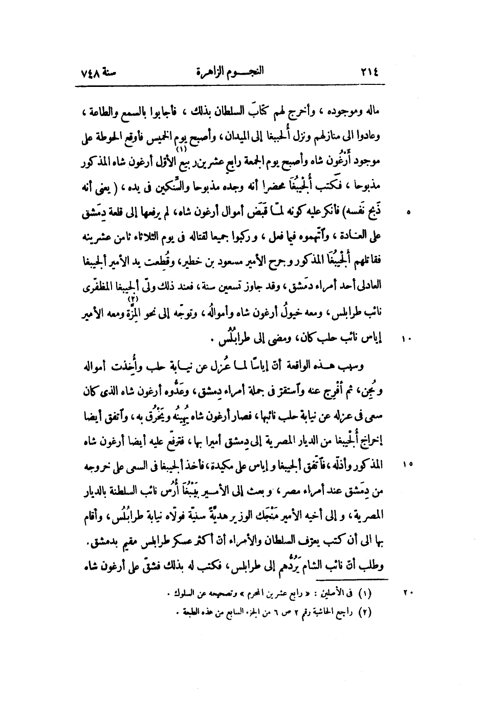 ماله وموجوده، وأخرج لهم كتاب السلطان بذلك، فأجابوا بالسمع والطاعة، وعادوا الى منازلهم ونزل ألجيبغا إلى الميدان، وأصبح يوم الخميس فأوقع الحوطة على موجود أرغون شاه وأصبح يوم الجمعة رابع عشرين ربيع «1» الأوّل أرغون شاه المذكور مذبوحا، فكتب ألجيبغا محضرا أنه وجده مذبوحا والسّكين فى يده، (يعنى أنه ذبح نفسه) فأنكر عليه كونه لمّا قبض أموال أرغون شاه، لم يرفعها إلى قلعة دمشق على العادة، واتّهموه فيما فعل، وركبوا جميعا لقتاله فى يوم الثلاثاء ثامن عشرينه فقاتلهم ألجيبغا المذكور وجرح الأمير مسعود بن خطير، وقطعت يد الأمير ألجيبغا العادلى أحد أمراء دمشق، وقد جاوز تسعين سنة، فعند ذلك ولّى ألجيبغا المظفّرى نائب طرابلس، ومعه خيول أرغون شاه وأمواله، وتوجّه إلى نحو المزّة «2» ومعه الأمير إياس نائب حلب كان، ومضى إلى طرابلس.