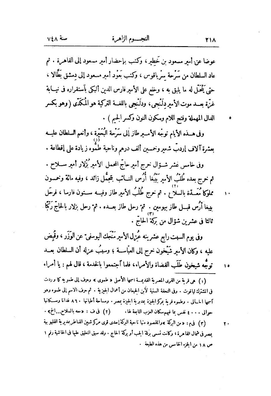 وفى هذه الأيام توجّه الأمير طاز إلى سرحة البحيرة، وأنعم السلطان عليه بعشرة آلاف اردبّ شعير وخمسين ألف درهم وناحية طمّوه «1» زيادة على إقطاعة.
