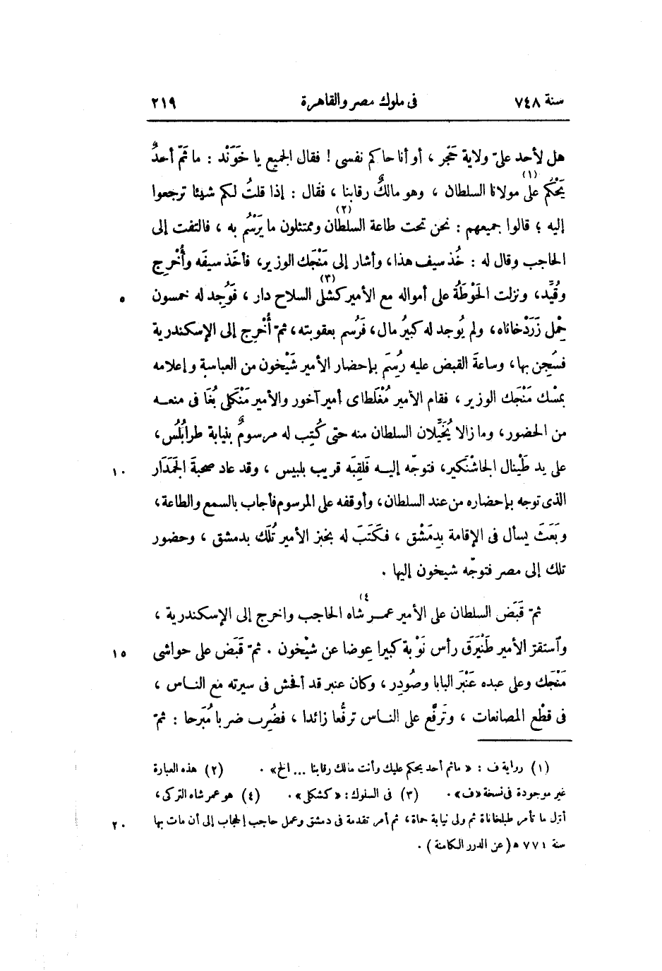 هل لأحد علىّ ولاية حجر، أو أنا حاكم نفسى! فقال الجميع يا خوند: ما ثمّ أحد يحكم على «1» مولانا السلطان، وهو مالك رقابنا، فقال: إذا قلت لكم شيئا ترجعوا إليه؛ قالوا جميعهم: نحن تحت طاعة السلطان «2» وممتثلون ما يرسم به، فالتفت إلى الحاجب وقال له: خذ سيف هذا، وأشار إلى منجك الوزير، فأخذ سيفه وأخرج وقيّد، ونزلت الحوطة على أمواله مع الأمير كشلى «3» السلاح دار، فوجد له خمسون حمل زردخاناه، ولم يوجد له كبير مال، فرسم بعقوبته، ثمّ أخرج إلى الإسكندرية فسجن بها، وساعة القبض عليه رسم بإحضار الأمير شيخون من العباسة وإعلامه بمسك منجك الوزير، فقام الأمير مغلطاى أمير آخور والأمير منكلى بغا فى منعه من الحضور، وما زالا يخيّلان السلطان منه حتى كتب له مرسوم بنيابة طرابلس، على يد طينال الجاشنكير، فتوجّه إليه فلقبه قريب بلبيس، وقد عاد صحبة الجمدار الذي توجه بإحضاره من عند السلطان، وأوقفه على المرسوم فأجاب بالسمع والطاعة، وبعث يسأل فى الإقامة بدمشق، فكتب له بخبز الأمير تلك بدمشق، وحضور تلك إلى مصر فتوجّه شيخون إليها.