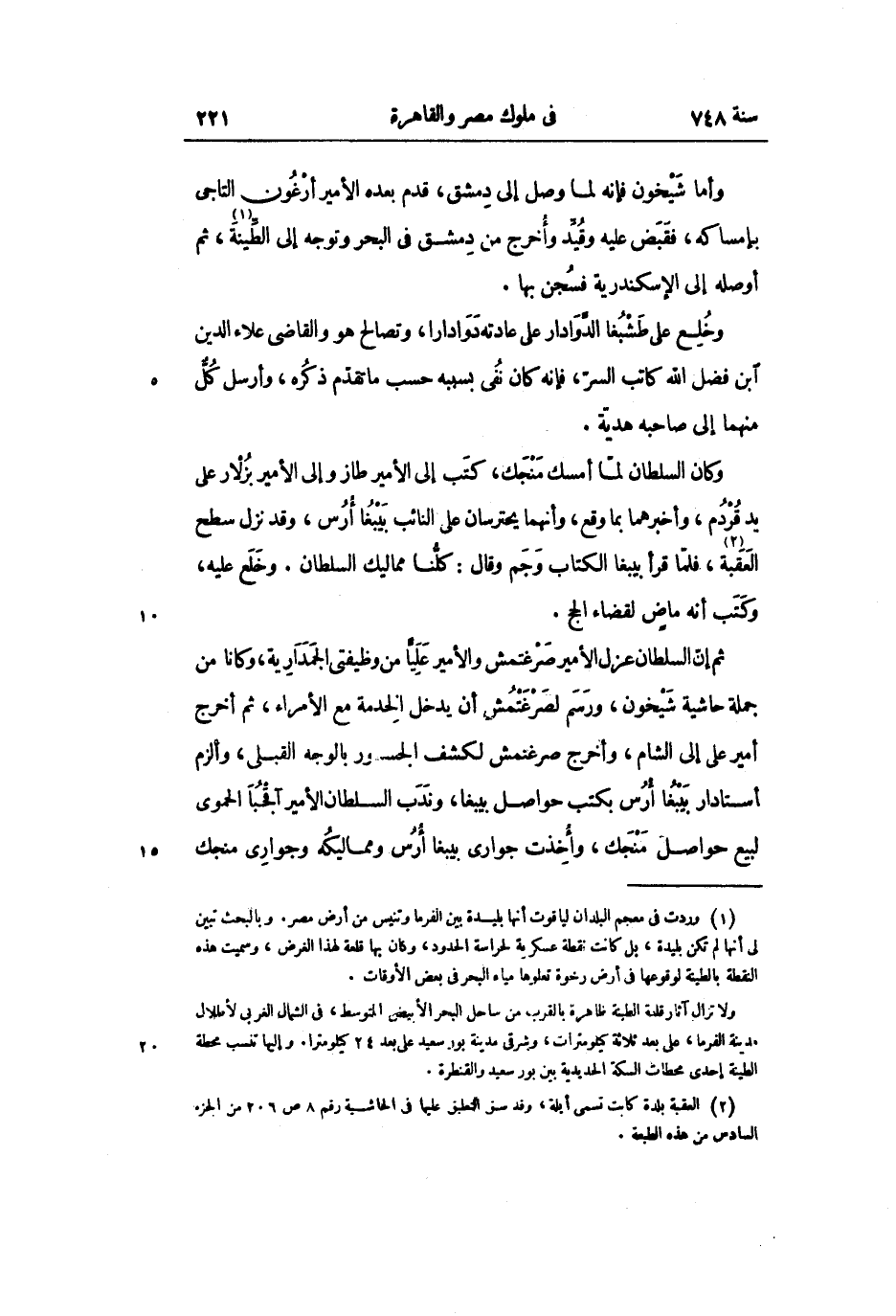 وأما شيخون فإنه لما وصل إلى دمشق، قدم بعده الأمير أرغون التاجى بإمساكه، فقبض عليه وقيّد وأخرج من دمشق فى البحر وتوجه إلى الطّينة «1» ، ثم أوصله إلى الإسكندرية فسجن بها.
