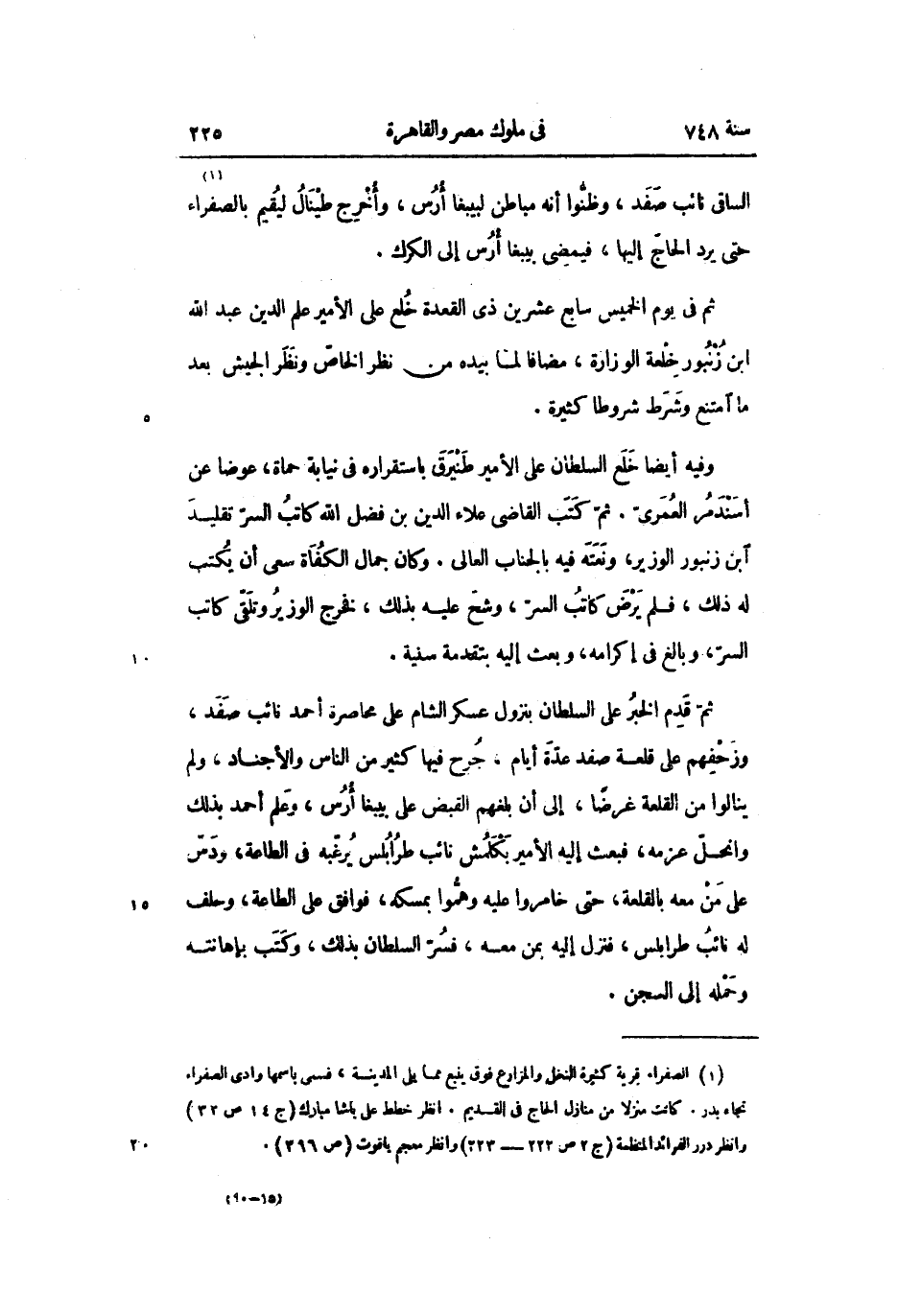 الساقى نائب صفد، وظنّوا أنه مباطن لبيبغا أرس، وأخرج طينال ليقيم بالصفراء «1» حتى يرد الحاجّ إليها، فيمضى بيبغا أرس إلى الكرك.