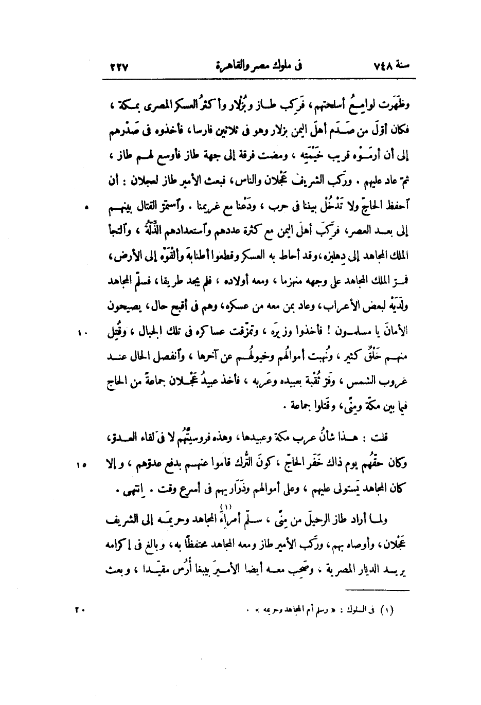 ولما أراد طاز الرحيل من منى، سلّم أمراء «1» المجاهد وحريمه إلى الشريف عجلان، وأوصاه بهم، وركب الأمير طاز ومعه المجاهد محتفظا به، وبالغ فى إكرامه يريد الديار المصرية، وصحب معه أيضا الأمير بيبغا أرس مقيّدا، وبعث