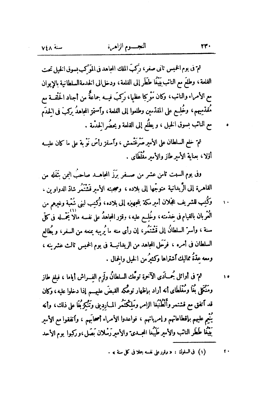 ثمّ فى يوم الخميس ثانى صفر، ركب الملك المجاهد فى الموكب بسوق الخيل تحت القلعة، وطلع مع النائب بيبغا ططر إلى القلعة، ودخل الى الخدمة السلطانية بالإيوان مع الأمراء والنائب، وكان موكبا عظيما، ركب فيه جماعة من أجناد الحلقة مع مقدّميهم، وخلع على المقدّمين وطلعوا إلى القلعة، واستمرّ المجاهد يركب فى الخدم مع النائب بسوق الخيل، ويطلع إلى القلعة ويحضر الخدمة.