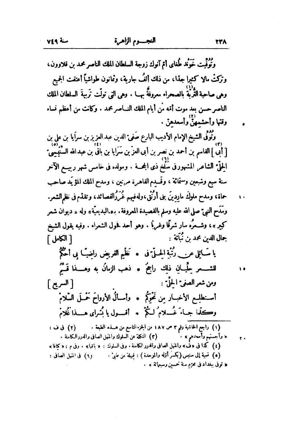 وتوفّى الشيخ الإمام الأديب البارع صفىّ الدين عبد العزيز بن سرايا بن على بن [أبى «3» ] القاسم بن أحمد بن نصر بن أبى العزّ بن سرايا بن باقى «4» بن عبد الله السّنبسىّ «5» الحلّىّ الشاعر المشهور فى سلخ «6» ذى الحجة. ومولده فى خامس شهر ربيع الآخر سنة سبع وسبعين وستمائة، وقدم القاهرة مرتين، ومدح الملك المؤيّد صاحب حماة، ومدح ملوك ماردين بنى أرتق، وله فيهم غرر القصائد، وتقدّم فى نظم الشعر.