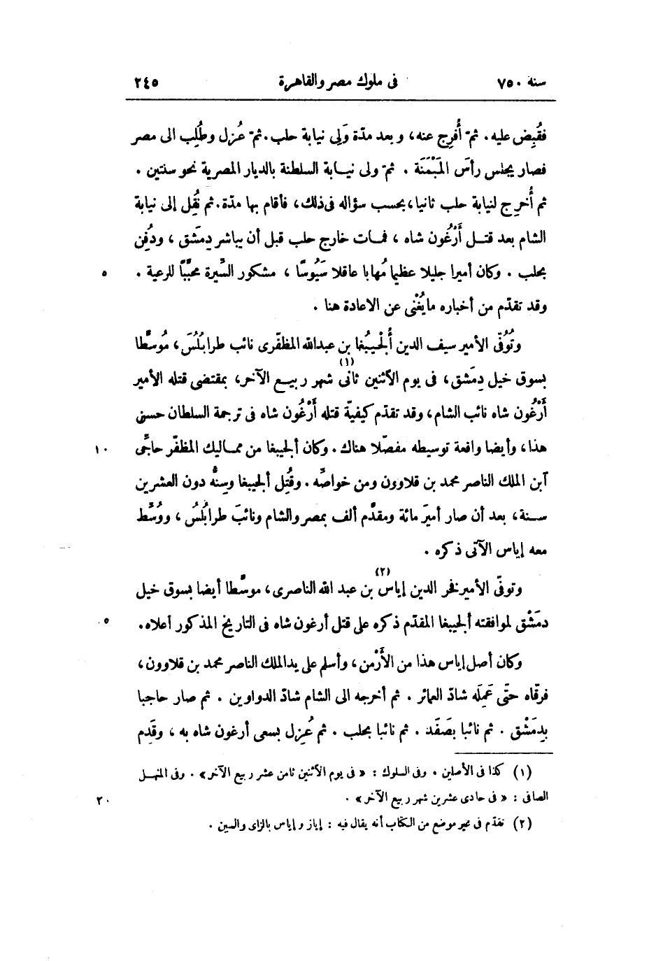 وتوفّى الأمير فخر الدين إياس «2» بن عبد الله الناصرى، موسّطا أيضا بسوق خيل دمشق لموافقته ألجيبغا المقدّم ذكره على قتل أرغون شاه فى التاريخ المذكور أعلاه.