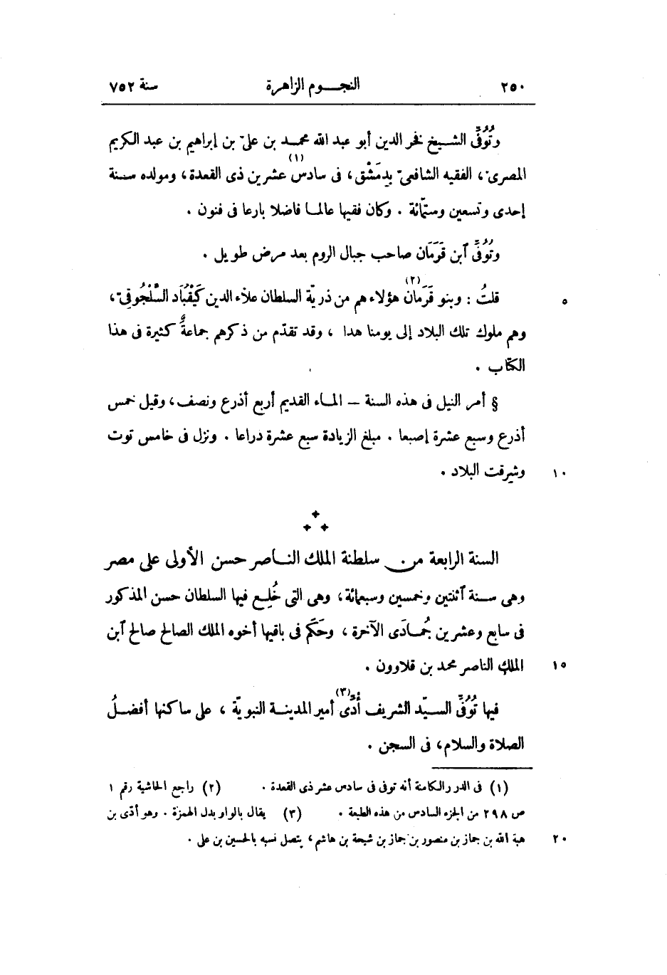 السنة الرابعة من سلطنة الملك الناصر حسن الأولى على مصر وهى سنة اثنتين وخمسين وسبعمائة، وهى التى خلع فيها السلطان حسن المذكور فى سابع وعشرين جمادى الآخرة، وحكم فى باقيها أخوه الملك الصالح صالح ابن الملك الناصر محمد بن قلاوون.
