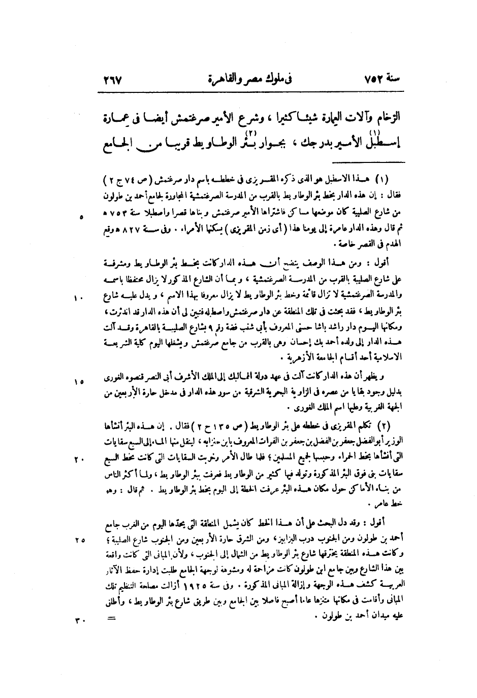 الرّخام وآلات العمارة شيئا كثيرا، وشرع الأمير صرغتمش أيضا فى عمارة إسطبل «1» الأمير بدرجك، بجوار بئر «2» الوطاويط قريبا من الجامع