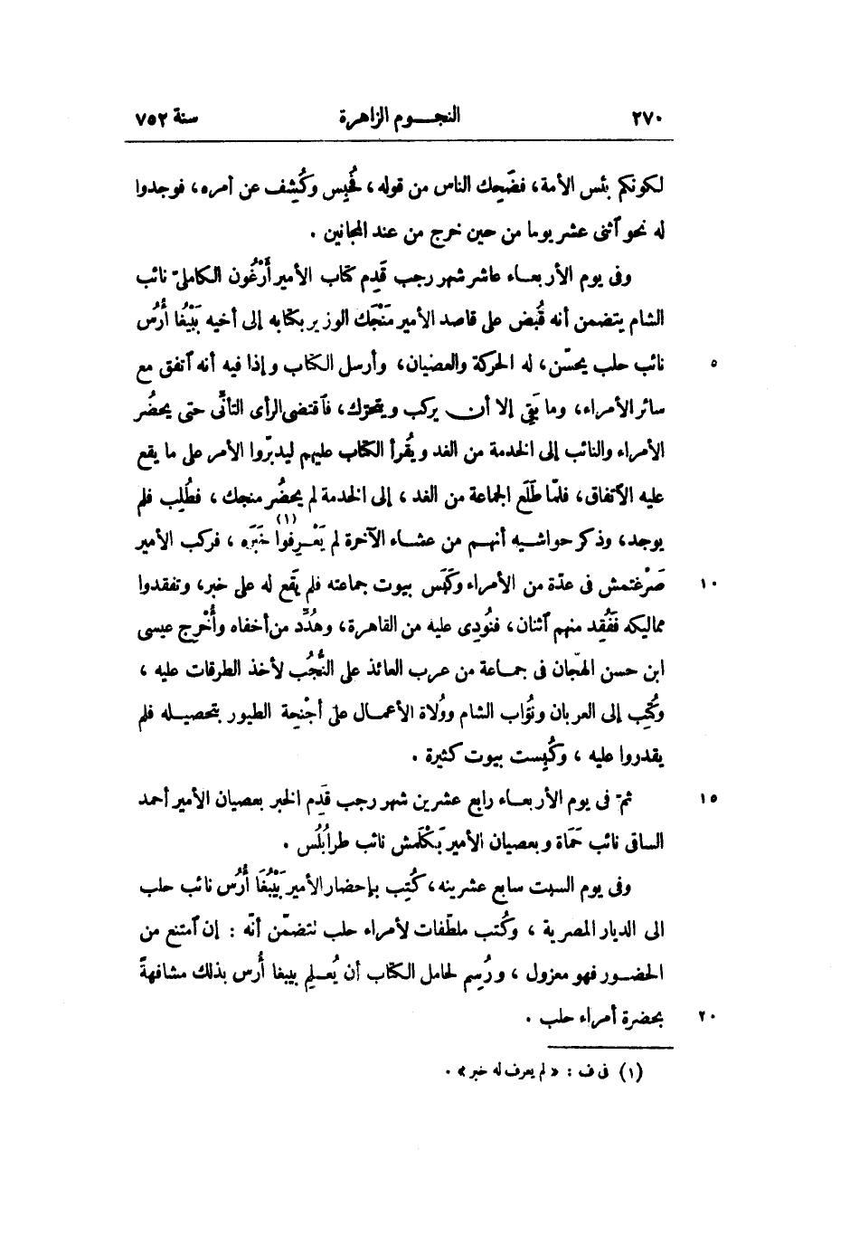 وفى يوم الأربعاء عاشر شهر رجب قدم كتاب الأمير أرغون الكاملىّ نائب الشام يتضمن أنه قبض على قاصد الأمير منجك الوزير بكتابه إلى أخيه ببيغا أرس نائب حلب يحسّن، له الحركة والعصيان، وأرسل الكتاب وإذا فيه أنه اتفق مع سائر الأمراء، وما بقى إلا أن يركب ويتحرّك، فاقتضى الرأى التأنّى حتى يحضر الأمراء والنائب إلى الخدمة من الغد ويقرأ الكتاب عليهم ليدبّروا الأمر على ما يقع عليه الاتفاق، فلمّا طلع الجماعة من الغد، إلى الخدمة لم يحضر منجك، فطلب فلم يوجد، وذكر حواشيه أنهم من عشاء الآخرة لم يعرفوا «1» خبره، فركب الأمير صرغتمش فى عدّة من الأمراء وكبس بيوت جماعته فلم يقع له على خبر، وتفقدوا مماليكه ففقد منهم اثنان، فنودى عليه من القاهرة، وهدّد من أخفاه وأخرج عيسى ابن حسن الهجان فى جماعة من عرب العائذ على النّجب لأخذ الطرقات عليه، وكتب إلى العربان ونوّاب الشام وولاة الأعمال على أجنحة الطيور بتحصيله فلم يقدروا عليه، وكبست بيوت كثيرة.
