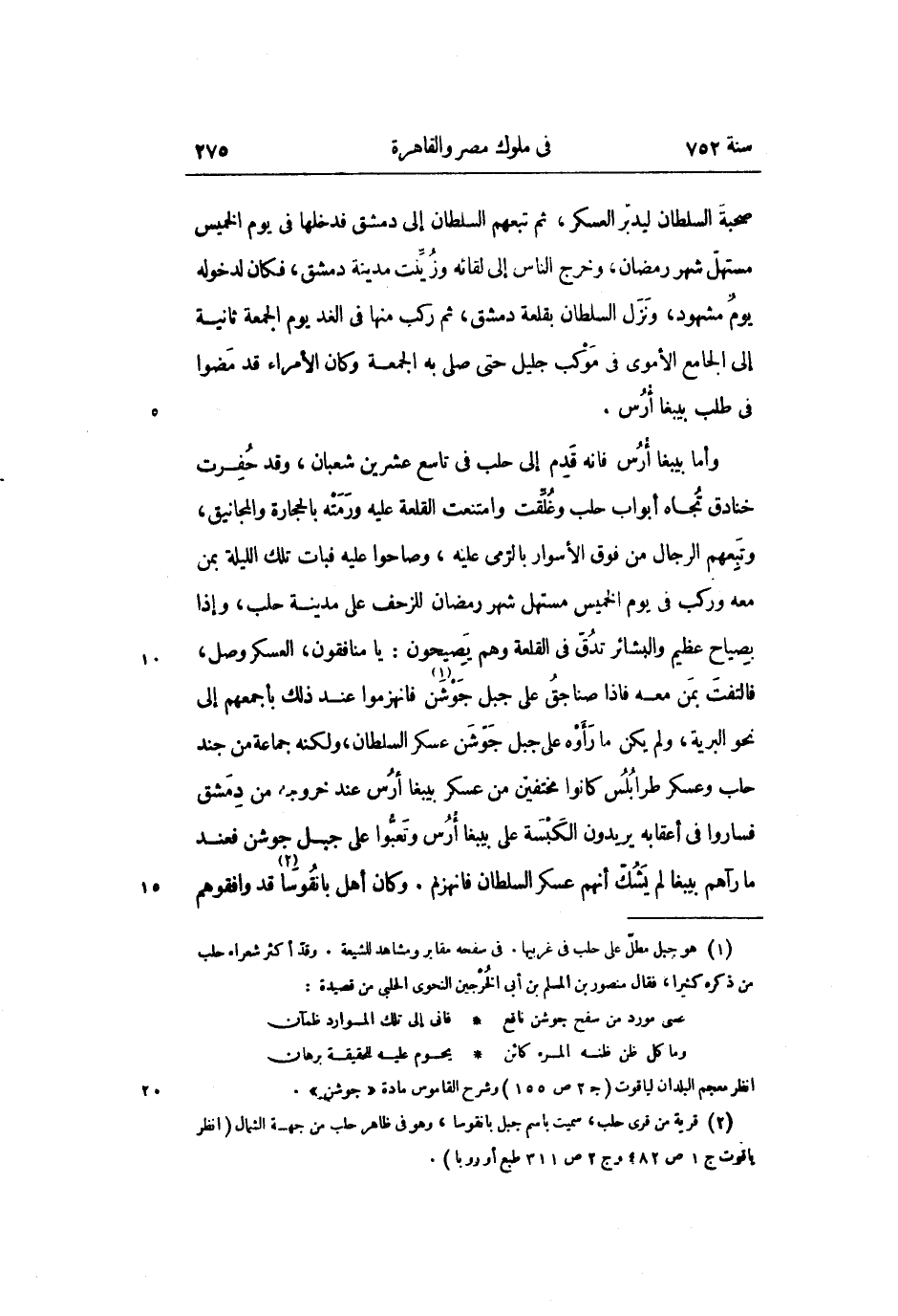 وأما بيبغا أرس فانه قدم إلى حلب فى تاسع عشرين شعبان، وقد حفرت خنادق تجاه أبواب حلب وغلّقت وامتنعت القلعة عليه ورمته بالحجارة والمجانيق، وتبعهم الرجال من فوق الأسوار بالرّمى عليه، وصاحوا عليه فبات تلك الليلة بمن معه وركب فى يوم الخميس مستهل شهر رمضان للزحف على مدينة حلب، وإذا بصياح عظيم والبشائر تدقّ فى القلعة وهم يصيحون: يا منافقون، العسكر وصل، فالتفت بمن معه فاذا صناجق على جبل جوشن «1» فانهزموا عند ذلك بأجمعهم إلى نحو البرية، ولم يكن ما رأوه على جبل جوشن عسكر السلطان، ولكنه جماعة من جند حلب وعسكر طرابلس كانوا مختفين من عسكر بيبغا أرس عند خروجه من دمشق فساروا فى أعقابه يريدون الكبسة على بيبغا أرس وتعبّوا على جبل جوشن فعند ما رآهم بيبغا لم يشكّ أنهم عسكر السلطان فانهزم. وكان أهل بانقوسا «2» قد وافقوهم