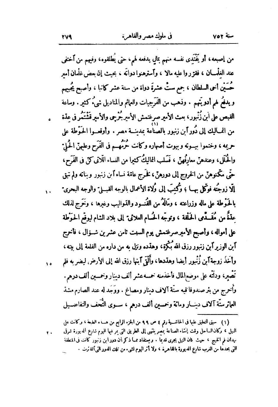 من إصبعه، أو يفتدى نفسه منهم بمال يدفعه لهم، حتى يطلقوه، وفيهم من اختفى عند الغلمان، فقرّروا عليه مالا، واسترهنوا دواته، بحيث إنّ بعض غلمان أمير حسين أخى السلطان، جمع ستّ عشرة دواة من ستة عشر كاتبا، وأصبح يجبيهم ويدفع لهم أدويتهم. وذهب من الفرجيات والعمائم والمناديل شىء كثير. وساعة القبص على ابن زنبور، بعث الأمير صرغتمش الأمير جرچى والأمير قشتمر فى عدّة من المماليك إلى دور ابن زنبور بالصناعة «1» بمدينة مصر. وأوقعوا الحوطة على حريمه، وختموا بيوته وبيوت أصهاره وكانت حرمهم فى الفرح وعليهنّ الحلىّ والحلل، وعندهنّ معارفهنّ، فسلب المماليك كثيرا من النساء اللّاتى كنّ فى الفرح، حتّى مكّنوهنّ من الخروج إلى دورهنّ، فخرج عامّة نساء ابن زنبور وبناته ولم تبق إلّا زوجته فوكّل بها؛ وكتب إلى ولاة الأعمال بالوجه القبلىّ والوجه البحرىّ بالحوطة على ماله وزراعته، وماله من القنود والدّواليب وغيرها، وخرج لذلك عدّة من مقدّمى الحلقة، وتوجّه الحسام العلائىّ إلى بلاد الشام ليوقّع الحوطة على أمواله، وأصبح الأمير صرغتمش يوم السبت ثامن عشرين شوّال، فأخرج ابن الوزير ابن زنبور رزق الله بكرة، وهدّده ونزل به من داره من القلعة إلى بيته، وأخذ زوجة ابن زنبور أيضا وهدّدها، وألقى ابنها رزق الله إلى الأرض ليضربه فلم تصبر، ودلته على موضع المال فأخذ منه خمسه عشر ألف دينار وخمسين ألف درهم.