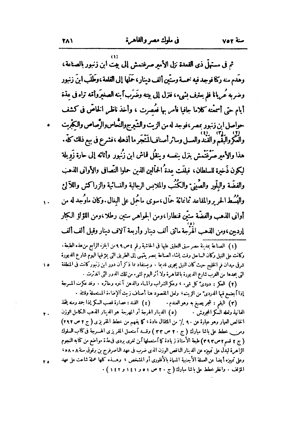 ثم فى مستهلّ ذى القعدة نزل الأمير صرغتمش إلى بيت «1» ابن زنبور بالصناعة، وهدم منه ركنا فوجد فيه خمسة وستّين ألف دينار، حملها إلى القلعة، وطلب ابن زنبور وضربه عريانا فلم يعترف بشىء، فنزل إلى بيته وضرب ابنه الصغير وأمّه تراه فى عدّة أيام حتى أسمعته كلاما جافيا فأمر بها فعصرت، وأخذ ناظر الخاصّ فى كشف حواصل ابن زنبور بمصر، فوجد له من الزيت والشّيرج والنّحاس والرّصاص والكبريت والعكر «2» والبقّم «3» والقند «4» والعسل وسائر أصناف المتجر ما أذهله، فشرع فى بيع ذلك كلّه.