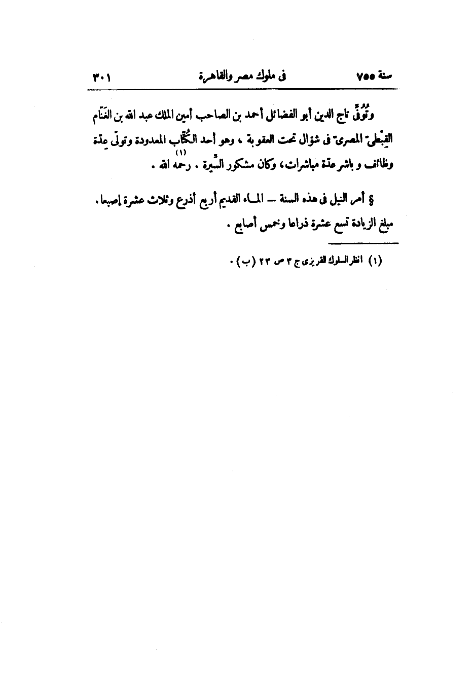 أمر النيل فى هذه السنة- الماء القديم أربع أذرع وثلاث عشرة إصبعا.