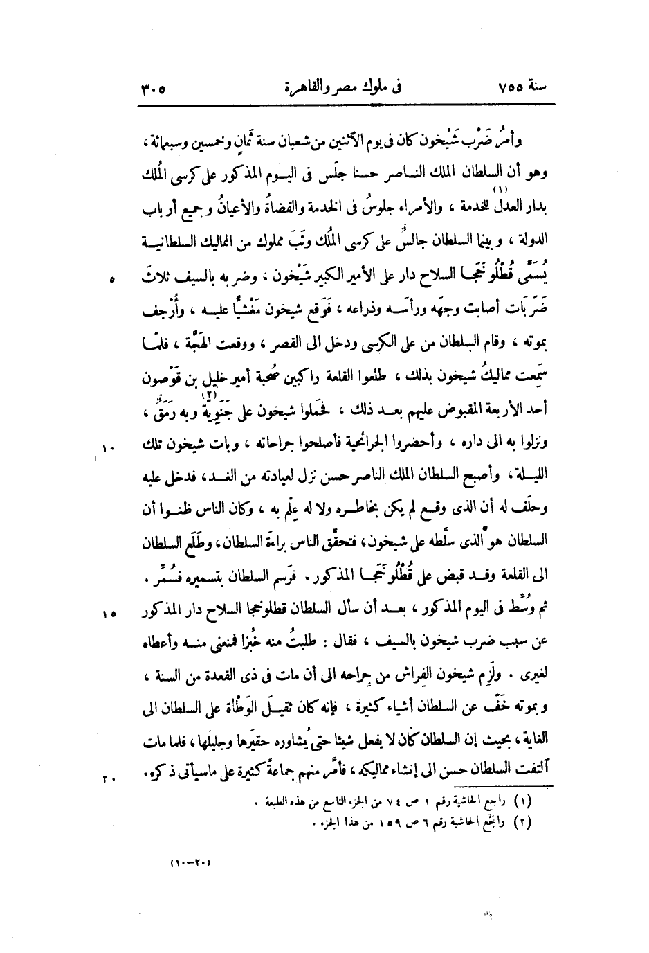 وأمر ضرب شيخون كان فى يوم الاثنين من شعبان سنة ثمان وخمسين وسبعمائة، وهو أن السلطان الملك الناصر حسنا جلس فى اليوم المذكور على كرسى الملك بدار العدل «1» للخدمة، والأمراء جلوس فى الخدمة والقضاة والأعيان وجميع أرباب الدولة، وبينما السلطان جالس على كرسى الملك وثب مملوك من المماليك السلطانية يسمّى قطلو خجا السلاح دار على الأمير الكبير شيخون، وضربه بالسيف ثلاث ضربات أصابت وجهه ورأسه وذراعه، فوقع شيخون مغشيّا عليه، وأرجف بموته، وقام السلطان من على الكرسى ودخل الى القصر، ووقعت الهجّة، فلمّا سمعت مماليك شيخون بذلك، طلعوا القلعة راكبين صحبة أمير خليل بن قوصون أحد الأربعة المقبوض عليهم بعد ذلك، فحملوا شيخون على جنويّة «2» وبه رمق، ونزلوا به الى داره، وأحضروا الجرائحية فأصلحوا جراحاته، وبات شيخون تلك الليلة، وأصبح السلطان الملك الناصر حسن نزل لعيادته من الغد، فدخل عليه وحلف له أن الذي وقع لم يكن بخاطره ولا له علم به، وكان الناس ظنوا أن السلطان هو الذي سلّطه على شيخون، فتحقّق الناس براءة السلطان، وطلع السلطان الى القلعة وقد قبض على قطلو خجا المذكور، فرسم السلطان بتسميره فسمّر.