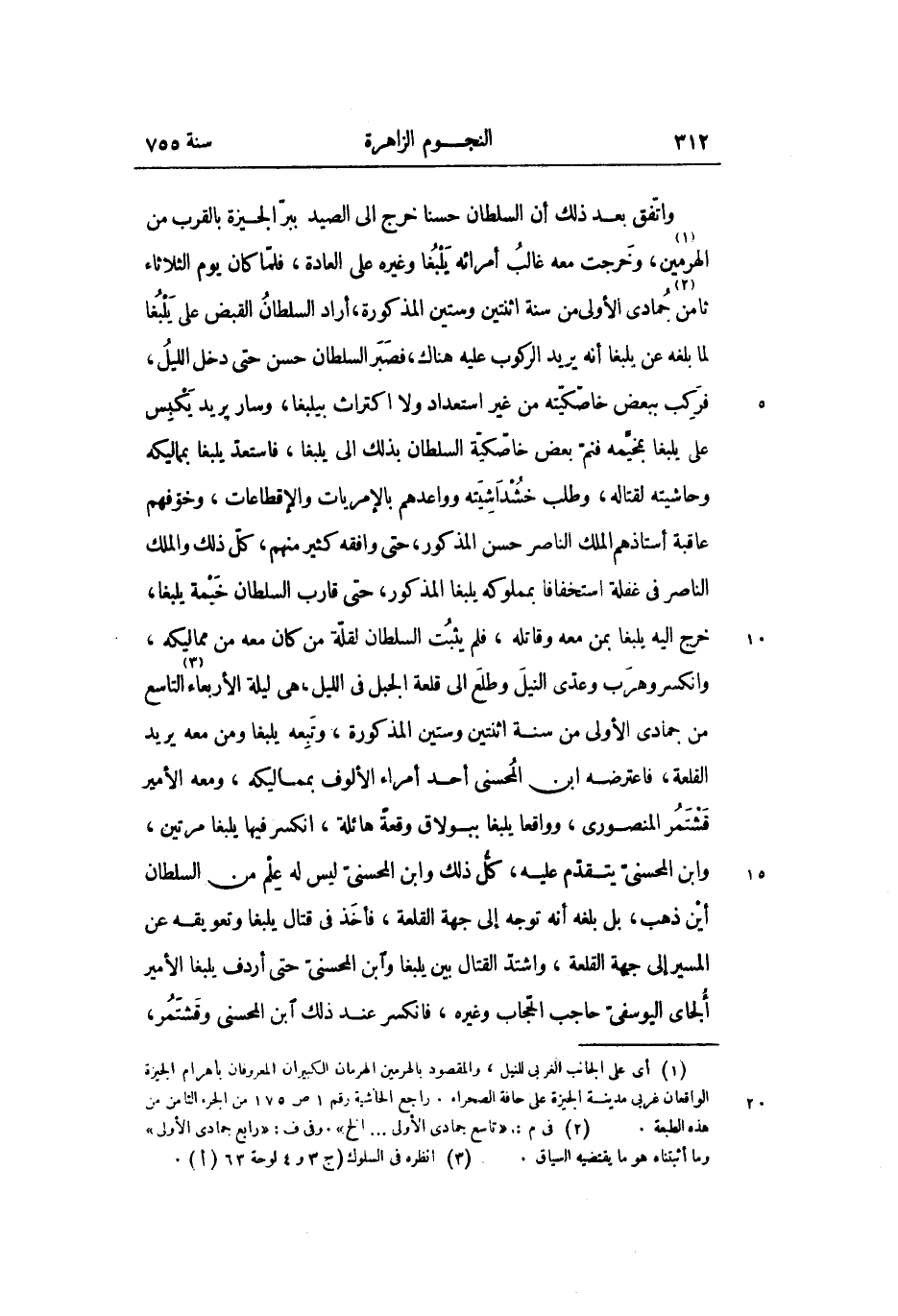 واتّفق بعد ذلك أن السلطان حسنا خرج الى الصيد ببرّ الجيزة بالقرب من الهرمين «1» ، وخرجت معه غالب أمرائه يلبغا وغيره على العادة، فلمّا كان يوم الثلاثاء ثامن «2» جمادى الأولى من سنة اثنتين وستين المذكورة، أراد السلطان القبض على يلبغا لما بلغه عن يلبغا أنه يريد الركوب عليه هناك، فصبر السلطان حسن حتى دخل الليل، فركب ببعض خاصّكيّته من غير استعداد ولا اكتراث بيلبغا، وسار يريد يكبس على يلبغا بمخيّمه فنمّ بعض خاصّكيّة السلطان بذلك الى يلبغا، فاستعدّ يلبغا بمماليكه وحاشيته لقتاله، وطلب خشداشيته وواعدهم بالإمريات والإقطاعات، وخوّفهم عاقبة أستاذهم الملك الناصر حسن المذكور، حتى وافقه كثير منهم، كلّ ذلك والملك الناصر فى غفلة استخفافا بمملوكه يلبغا المذكور، حتى قارب السلطان خيمة يلبغا، خرج اليه يلبغا بمن معه وقاتله، فلم يثبت السلطان لقلّة من كان معه من مماليكه، وانكسر وهرب وعدّى النيل وطلع الى قلعة الجبل فى الليل، هى ليلة الأربعاء «3» التاسع من جمادى الأولى من سنة اثنتين وستين المذكورة، وتبعه يلبغا ومن معه يريد القلعة، فاعترضه ابن المحسنى أحد أمراء الألوف بمماليكه، ومعه الأمير قشتمر المنصورى، وواقعا يلبغا ببولاق وقعة هائلة، انكسر فيها يلبغا مرتين، وابن المحسنىّ يتقدّم عليه، كلّ ذلك وابن المحسنىّ ليس له علم من السلطان أين ذهب، بل بلغه أنه توجه إلى جهة القلعة، فأخذ فى قتال يلبغا وتعويقه عن المسير إلى جهة القلعة، واشتدّ القتال بين يلبغا وابن المحسنىّ حتى أردف يلبغا الأمير ألجاى اليوسفىّ حاجب الحجّاب وغيره، فانكسر عند ذلك ابن المحسنى وقشتمر،