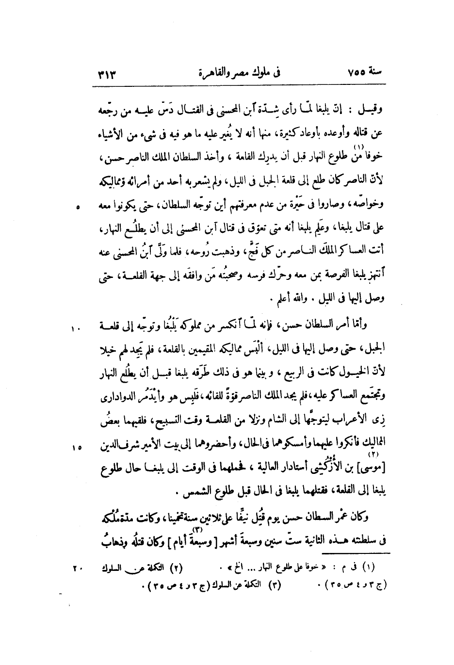 وأمّا أمر السلطان حسن، فإنه لمّا انكسر من مملوكه يلبغا وتوجّه إلى قلعة الجبل، حتى وصل إليها فى الليل، ألبس مماليكه المقيمين بالقلعة، فلم يجد لهم خيلا لأنّ الخيول كانت فى الربيع، وبينما هو فى ذلك طرقه يلبغا قبل أن يطلع النهار وتجتمع العساكر عليه، فلم يجد الملك الناصر قوّة للقائه، فلبس هو وأيدمر الدوادارى زى الأعراب ليتوجّها إلى الشام ونزلا من القلعة وقت التسبيح، فلقيهما بعض المماليك فأنكروا عليهما وأمسكوهما فى الحال، وأحضروهما إلى بيت الأمير شرف الدين [موسى «2» ] بن الأزكشى أستادار العالية، فحملهما فى الوقت إلى يلبغا حال طلوع يلبغا إلى القلعة، فقتلهما يلبغا فى الحال قبل طلوع الشمس.