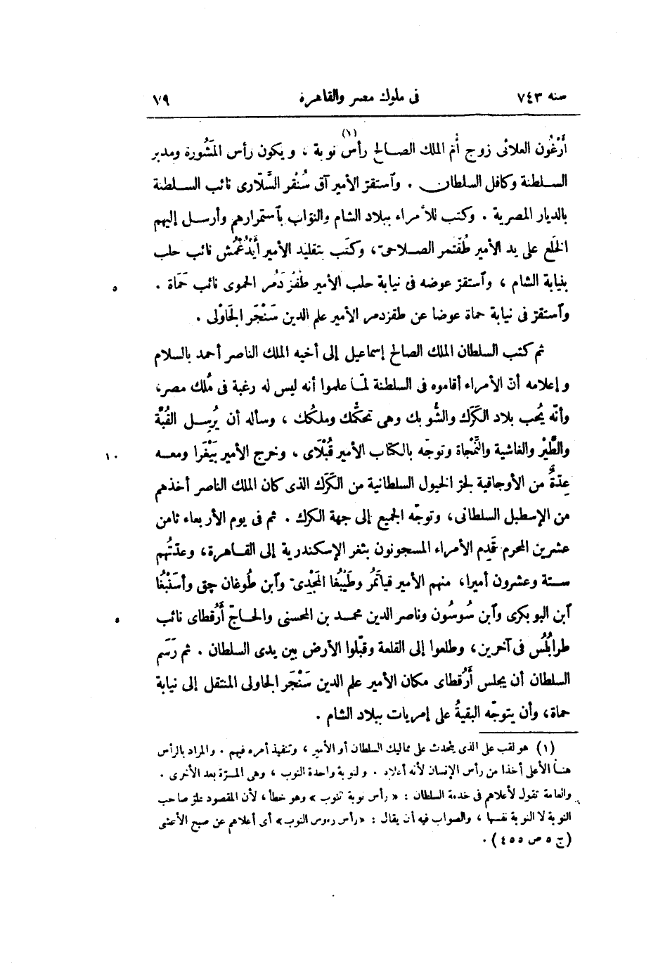 أرغون العلائى زوج أمّ الملك الصالح رأس «1» نوبة، ويكون رأس المشورة ومدبر السلطنة وكافل السلطان. واستقرّ الأمير آق سنقر السّلّارى نائب السلطنة بالديار المصرية. وكتب للأمراء ببلاد الشام والنوّاب باستمرارهم وأرسل إليهم الخلع على يد الأمير طقتمر الصلاحىّ، وكتب بتقليد الأمير أيدغمش نائب حلب بنيابة الشام، واستقرّ عوضه فى نيابة حلب الأمير طقزدمر الحموى نائب حماة.