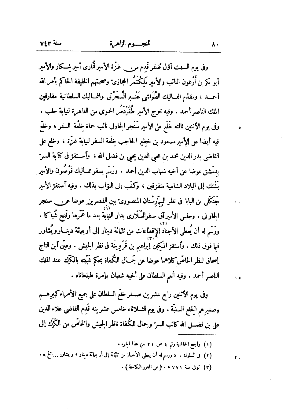 ورسم له أن يعطى الأجناد «2» الإقطاعات من ثلثمائة دينار إلى أربعمائة دينار ويشاور فيما فوق ذلك. واستقرّ المكين «3» إبراهيم بن قروينة فى نظر الجيش. وعيّن ابن التاج إسحاق لنظر الخاصّ كلاهما عوضا عن جمال الكفاة بحكم غيبته بالكرك عند الملك الناصر أحمد. وفيه أنعم السلطان على أخيه شعبان بإمرة طبلخاناه.