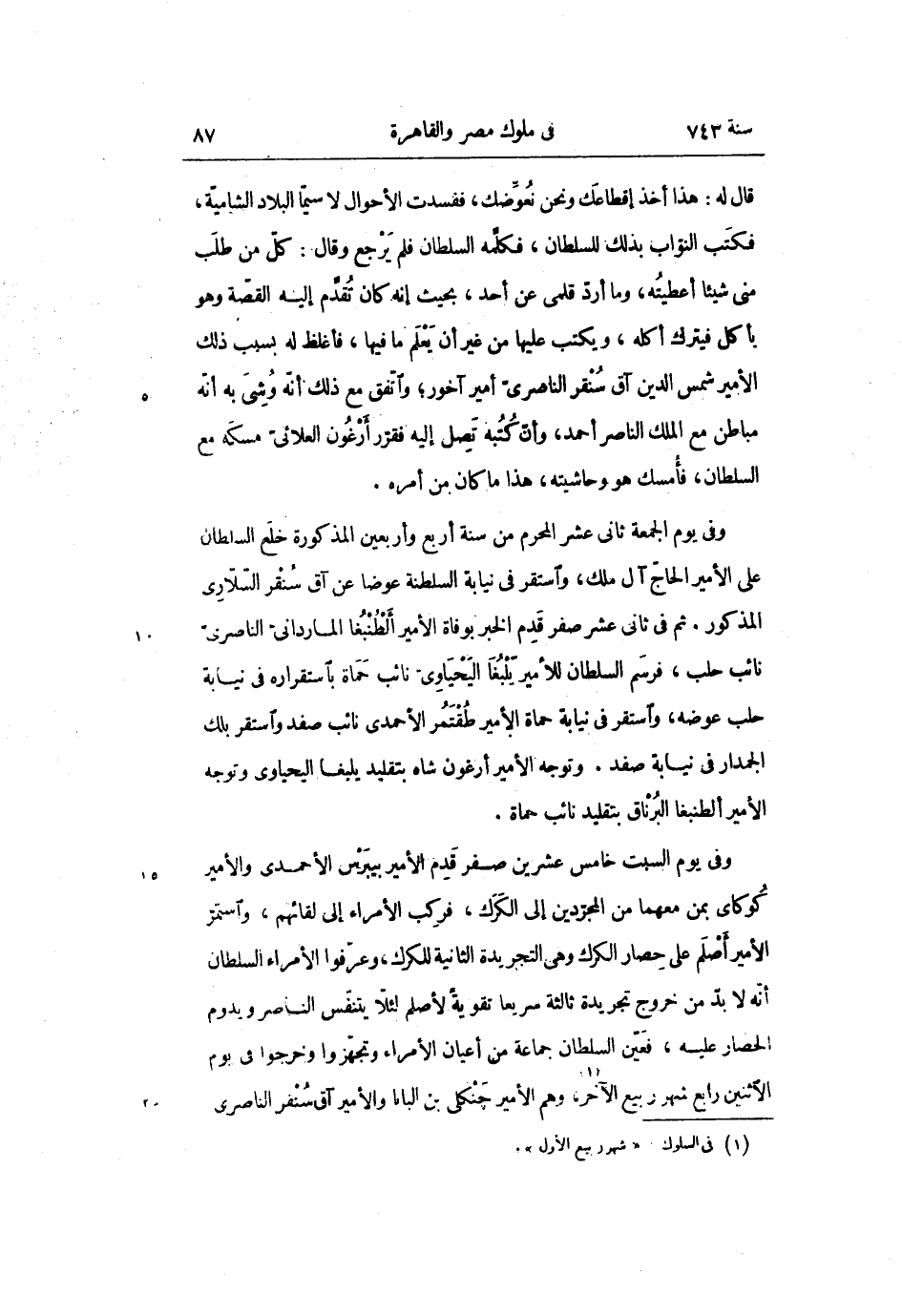 وفى يوم الجمعة ثانى عشر المحرم من سنة أربع وأربعين المذكورة خلع السلطان على الأمير الحاجّ آل ملك، واستقر فى نيابة السلطنة عوضا عن آق سنقر السّلّارى المذكور. ثم فى ثانى عشر صفر قدم الخبر بوفاة الأمير ألطنبغا الماردانىّ الناصرىّ نائب حلب، فرسم السلطان للأمير يلبغا اليحياوىّ نائب حماة باستقراره فى نيابة حلب عوضه، واستقر فى نيابة حماة الأمير طقتمر الأحمدى نائب صفد واستقر بلك الجمدار فى نيابة صفد. وتوجه الأمير أرغون شاه بتقليد يلبغا اليحياوى وتوجه الأمير ألطنبغا البرناق بتقليد نائب حماة.