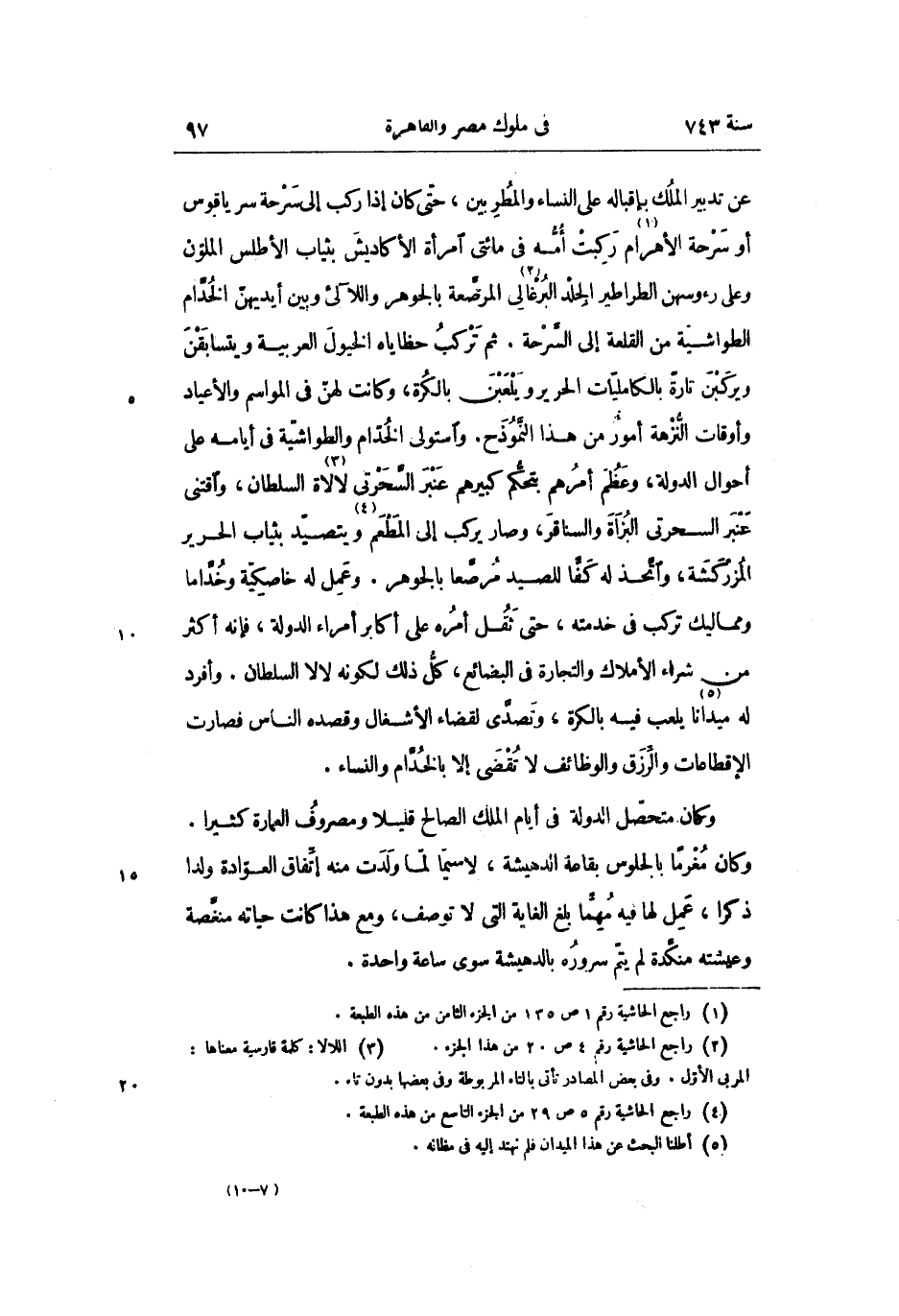 عن تدبير الملك بإقباله على النساء والمطربين، حتّى كان إذا ركب إلى سرحة سرياقوس أو سرحة الأهرام «1» ركبت أمّه فى مائتى امرأة الأكاديش بثياب الأطلس الملوّن وعلى رءوسهن الطراطير الجلد البرغالى «2» المرصّعة بالجوهر واللآلئ وبين أيديهنّ الخدّام الطواشية من القلعة إلى السّرحة. ثم تركب حظاياه الخيول العربية ويتسابقن ويركبن تارة بالكامليّات الحرير ويلعبن بالكرة، وكانت لهنّ فى المواسم والأعياد وأوقات النّزهة أمور من هذا النّموذج. واستولى الخدّام والطواشيّة فى أيامه على أحوال الدولة، وعظم أمرهم بتحكّم كبيرهم عنبر السّحرتى لالاة «3» السلطان، واقتنى عنبر السحرتى البزاة والسناقر، وصار يركب إلى المطعم «4» ويتصيّد بثياب الحرير المزركشة، واتّخذ له كفّا للصيد مرصّعا بالجوهر. وعمل له خاصكيّة وخدّاما ومماليك تركب فى خدمته، حتى ثقل أمره على أكابر أمراء الدولة، فإنه أكثر من شراء الأملاك والتجارة فى البضائع، كلّ ذلك لكونه لالا السلطان. وأفرد له ميدانا «5» يلعب فيه بالكرة، وتصدّى لقضاء الأشغال وقصده الناس فصارت الإقطاعات والرّزق والوظائف لا تقضى إلا بالخدّام والنساء.