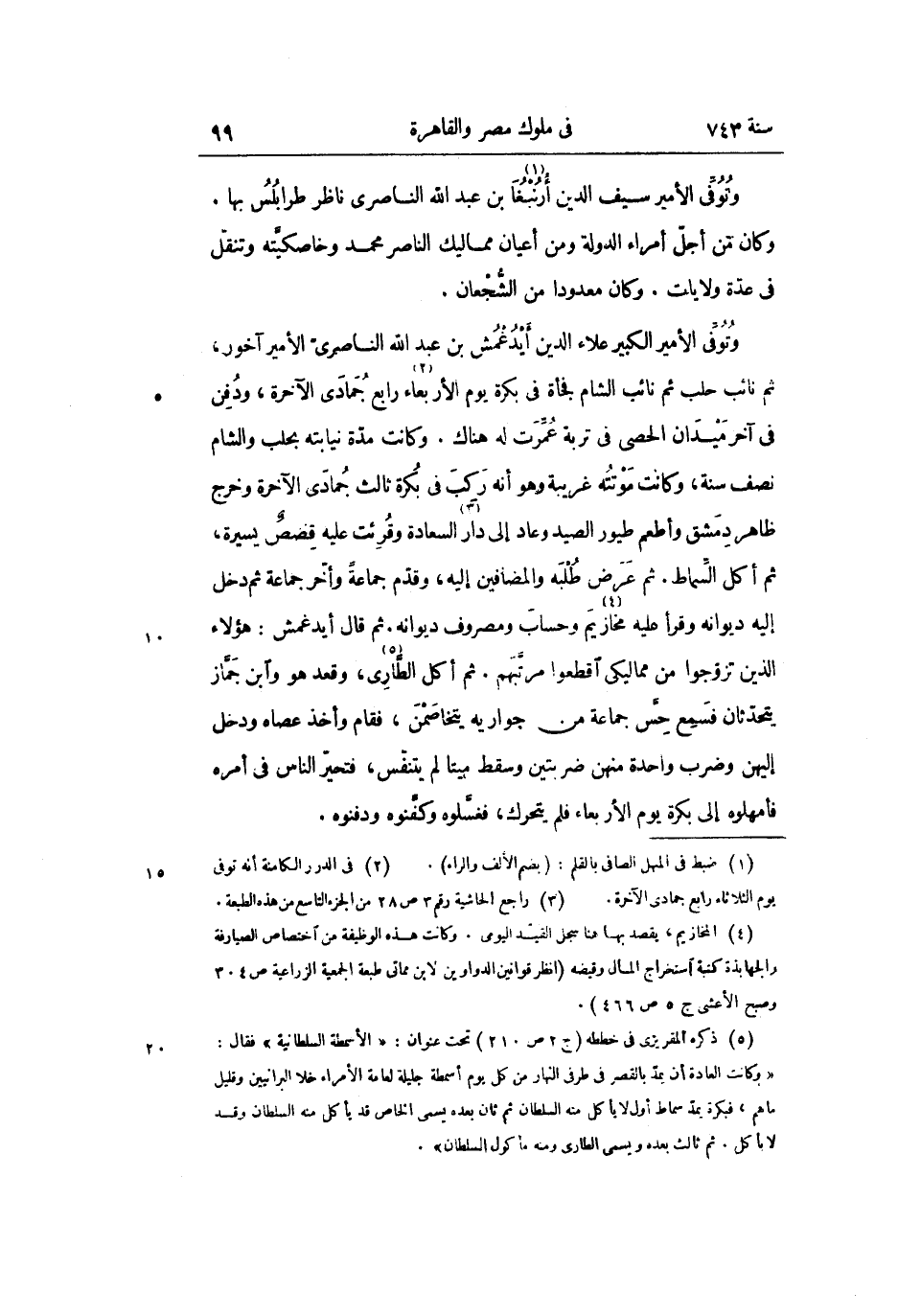 وتوفّى الأمير الكبير علاء الدين أيدغمش بن عبد الله الناصرىّ الأمير آخور، ثم نائب حلب ثم نائب الشام فجأة فى بكرة يوم الأربعاء «2» رابع جمادى الآخرة، ودفن فى آخر ميدان الحصى فى تربة عمّرت له هناك. وكانت مدّة نيابته بحلب والشام نصف سنة، وكانت موتته غريبة وهو أنه ركب فى بكرة ثالث جمادى الآخرة وخرج ظاهر دمشق وأطعم طيور الصيد وعاد إلى دار «3» السعادة وقرئت عليه قصص يسيرة، ثم أكل السّماط. ثم عرض طلبه والمضافين إليه، وقدّم جماعة وأخّر جماعة ثم دخل إليه ديوانه وقرأ عليه مخازيم «4» وحساب ومصروف ديوانه. ثم قال أيدغمش: هؤلاء الذين تزوّجوا من مماليكى اقطعوا مرتّبهم. ثم أكل الطّارى «5» ، وقعد هو وابن جمّاز يتحدّثان فسمع حسّ جماعة من جواريه يتخاصمن، فقام وأخذ عصاه ودخل إليهن وضرب واحدة منهن ضربتين وسقط ميتا لم يتنفّس، فتحيّر الناس فى أمره فأمهلوه إلى بكرة يوم الأربعاء فلم يتحرك، فغسّلوه وكفّنوه ودفنوه.