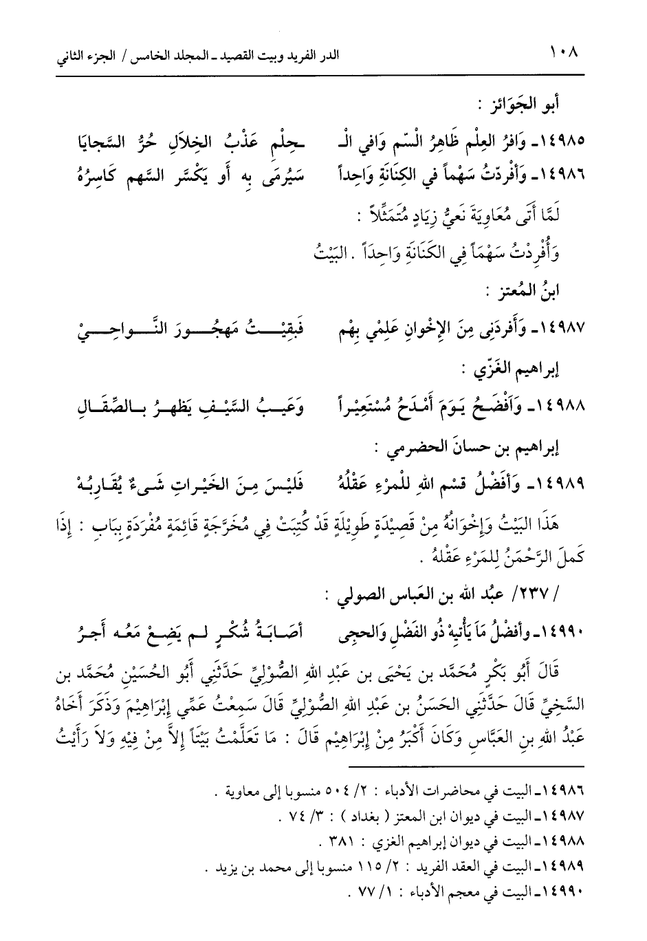 قَالَ أَبُو بَكْرٍ مُحَمَّد بن يَحْيَى بن عَبْدِ اللَّهِ الصُّوْليِّ حَدَّثَنِي أَبُو الحُسَيْنِ مُحَمَّد بن السَّخِيِّ قَالَ حَدَّثنِي الحَسَنُ بن عَبْدِ اللَّهِ الصُّوْليِّ قَالَ سَمِعْتُ عَمِّي إِبْرَاهِيْمَ وَذَكَرَ أَخَاهُ عَبْدُ اللَّهِ بنِ العَبَّاسِ وَكَانَ أَكْبَرُ مِنْ إِبْرَاهِيْم قَالَ: مَا تَعَلَّمْتُ بَيْتًا إِلَّا مِنْ فِيْهِ وَلَا رَأَيْتُ