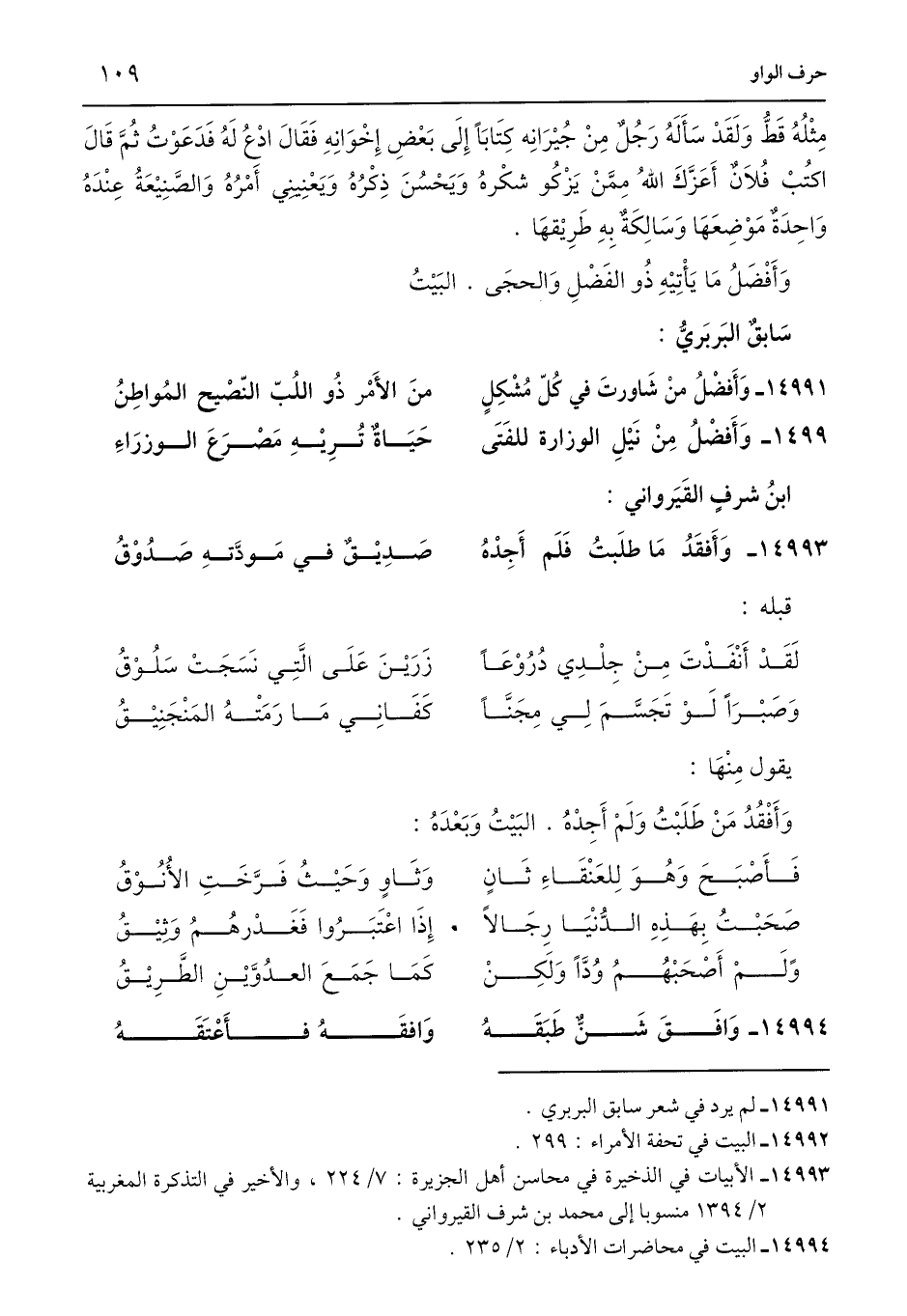 14993 - الأبيات في الذخيرة في محاسن أهل الجزيرة: 7/ 224، والأخير في التذكرة المغربية 2/ 1394 منسوبا إلى محمد بن شرف القيرواني.