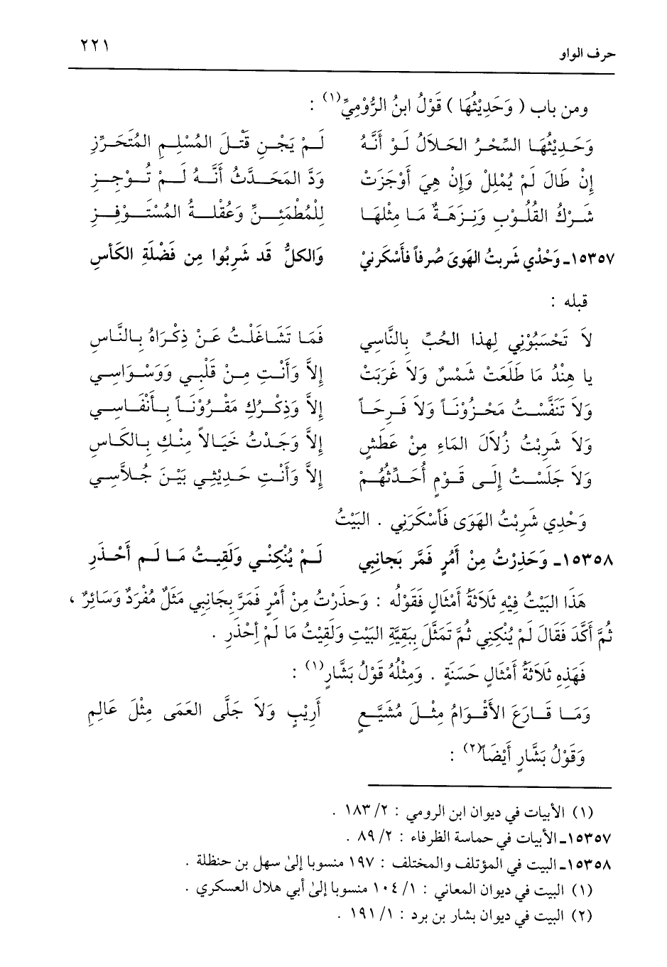ومن باب (وَحَدِيْثُهَا) قَوْلُ ابْنُ الرُّوْمِيِّ (¬1):