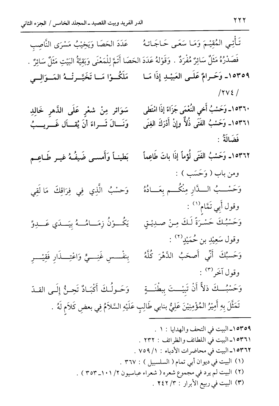 فَصَدْرُهُ مَثَلٌ سَائِرٌ مُفْرَدٌ. وَقَوْلهُ عَدَدَ الحَصا أَتَمَّ لِلْمَعْنَى وَبَقِيَّةُ البَيْتِ مَثَلٌ سَائِرٌ.