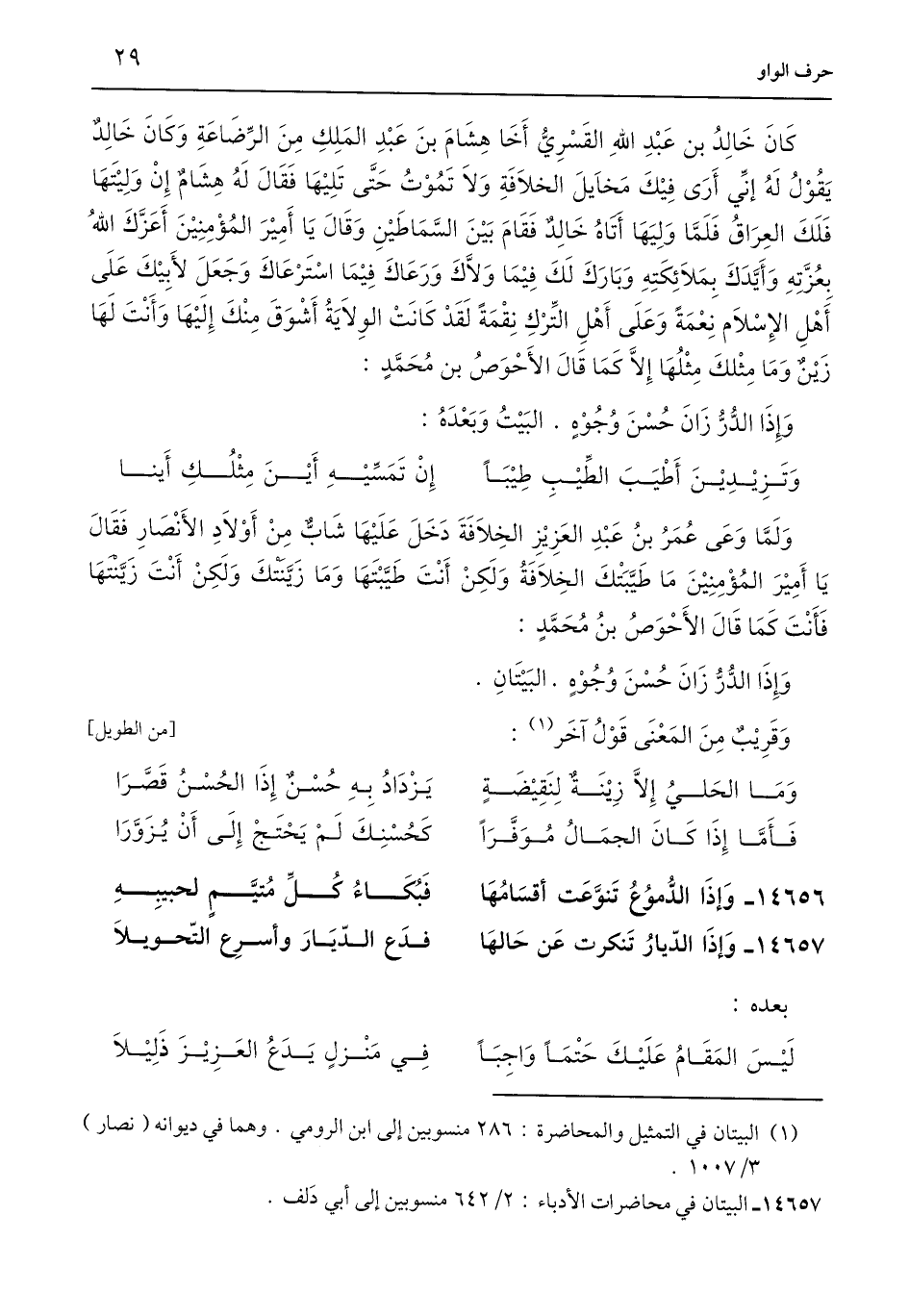 كَانَ خَالِدُ بن عَبْدِ اللَّهِ القَسْرِيُّ أَخَا هِشَامَ بنَ عَبْدِ المَلِكِ مِنَ الرِّضَاعَةِ وَكَانَ خَالِدٌ يَقُوْلُ لَهُ إنِّي أَرَى فِيْكَ مَخاَيلَ الخلَافَةِ وَلَا تَمُوْتُ حَتَّى تَلِيْهَا فَقَالَ لَهُ هِشَامٌ إِنْ وَلِيْتَهَا فَلَكَ العِرَاقُ فَلَمَّا وَلِيَهَا أَتَاهُ خَالِدٌ فَقَامَ بَيْنَ السَّمَاطَيْنِ وَقَالَ يَا أَمِيْرَ المُؤْمِنِيْنَ أَعَزَّكَ اللَّهُ بعُزَّتِهِ وَأَيَّدَكَ بِمَلَائِكَتِهِ وَبَارَكَ لَكَ فِيْمَا وَلَّاكَ وَرَعَاكَ فِيْمَا اسْتَرْعَاكَ وَجَعَلَ لأَبِيْكَ عَلَى أَهْلِ الإِسْلَام نِعْمَةً وَعَلَى أَهْلِ التِّرْكِ نِقْمَةً لَقَدْ كَانَتْ الوِلَايَةُ أَشْوَقَ مِنْكَ إِلَيْهَا وَأَنْتَ لَهَا زَيْن وَمَا مِثْلكَ مِثْلُهَا إِلَّا كَمَا قَالَ الأَحْوَصُ بن مُحَمَّدٍ:
