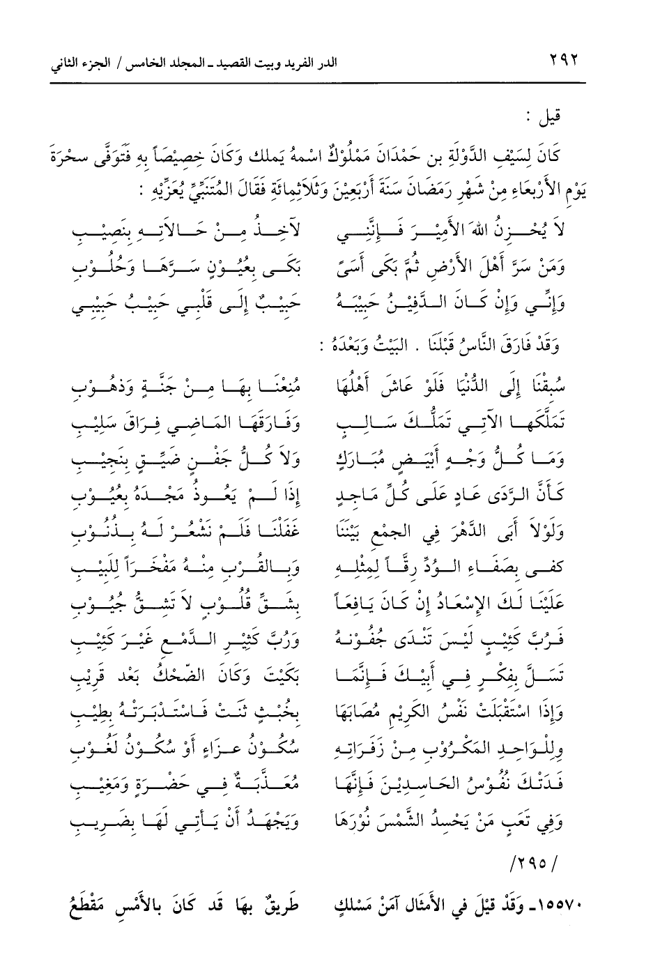 كَانَ لِسَيْفِ الدَّوْلَةِ بن حَمْدَانَ مَمْلُوْكٌ اسْمهُ يَملك وَكَانَ خِصيْصًا بِهِ فَتَوَفَّى سحْرَةَ يَوْمِ الأَرْبعَاءِ مِنْ شَهْرِ رَمَضَانَ سَنَةَ أَرْبَعِيْنَ وَثَلَاثِمِائَةِ فَقَالَ المُتَنَبِّيِّ يُعَزِّيْهِ: