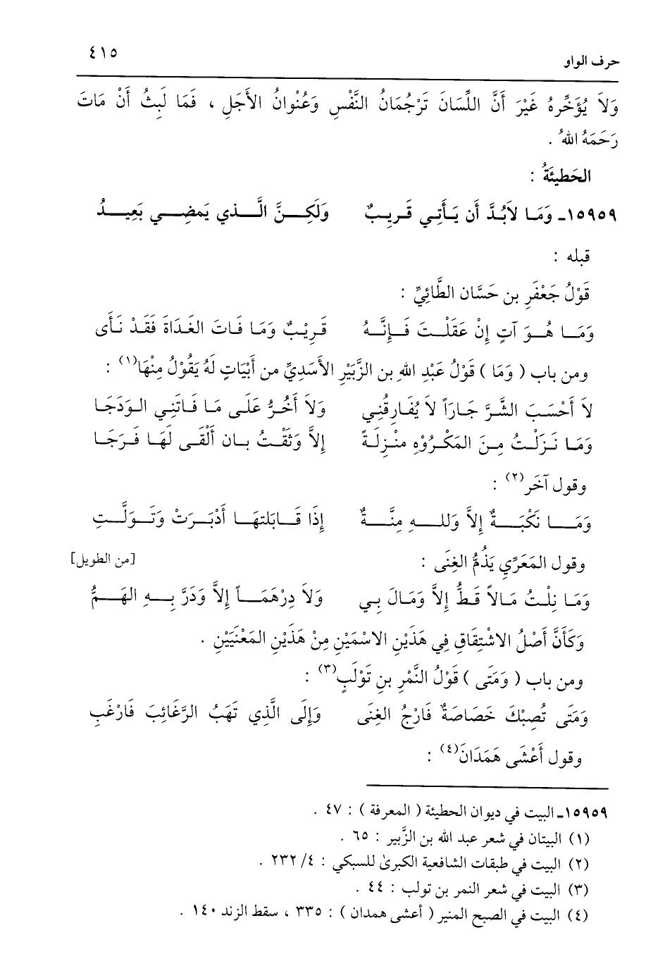 ومن باب (وَمَا) قَوْلُ عَبْدِ اللَّهِ بن الزّبَيْرِ الأَسَدِيِّ من أَبْيَاتٍ لَهُ يَقُوْلُ مِنْهَا (¬1):