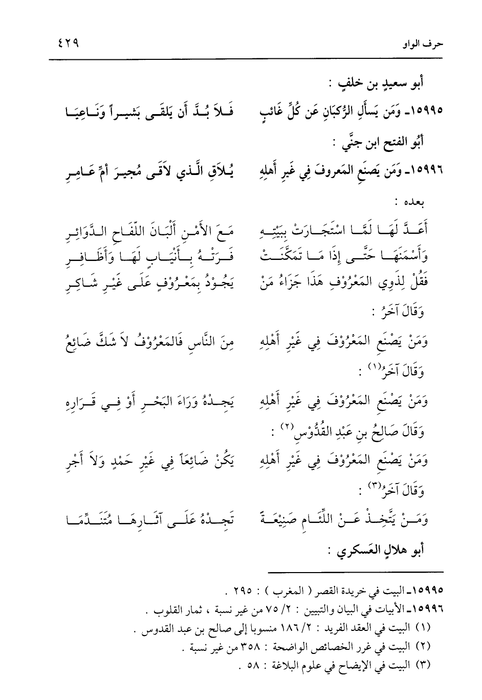 وَمَنْ يَصْنَعِ المَعْرُوْفَ فِي غَيْرِ أَهْلِهِ ... يَكُنْ ضَائِعًا فِي غَيْرِ حَمْدٍ وَلَا أَجْرِ