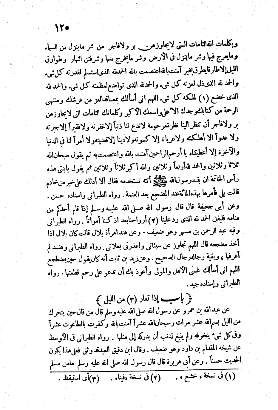 وَبِكَلِمَاتِ اللَّهِ التَّامَّاتِ الَّتِي لَا يُجَاوِزُهُنَّ بَرٌّ وَلَا فَاجِرٌ، مِنْ شَرِّ مَا يَنْزِلُ مِنَ السَّمَاءِ وَمَا يَعْرُجُ فِيهَا، وَشَرِّ مَا يَنْزِلُ فِي الْأَرْضِ وَشَرِّ مَا يَخْرُجُ مِنْهَا، وَشَرِّ فِتَنِ النَّهَارِ، وَطَوَارِقِ اللَّيْلِ إِلَّا طَارِقًا يَطْرُقُ بِخَيْرٍ، آمَنْتُ بِاللَّهِ، اعْتَصَمْتُ بِاللَّهِ، الْحَمْدُ لِلَّهِ الَّذِي اسْتَسْلَمَ لِقُدْرَتِهِ كُلُّ شَيْءٍ، وَالْحَمْدُ لِلَّهِ الَّذِي ذَلَّ لِعِزَّتِهِ كُلُّ شَيْءٍ، وَالْحَمْدُ لِلَّهِ الَّذِي تَوَاضَعَ لِعَظَمَتِهِ كُلُّ شَيْءٍ، وَالْحَمْدُ لِلَّهِ الَّذِي خَشَعَ لِمُلْكِهِ كُلُّ شَيْءٍ، اللَّهُمَّ إِنِّي أَسْأَلُكَ بِمَعَاقِدِ الْعِزِّ مِنْ عَرْشِكَ، وَمُنْتَهَى الرَّحْمَةِ مِنْ كِتَابِكَ، وَجَدِّكَ الْأَعْلَى، وَاسْمِكَ الْأَكْبَرِ، وَكَلِمَاتِكَ التَّامَّاتِ الَّتِي لَا يُجَاوِزُهُنَّ بَرٌّ وَلَا فَاجِرٌ، أَنْ تَنْظُرَ إِلَيْنَا نَظْرَةً مَرْحُومَةً، لَا تَدَعُ لَنَا ذَنْبًا إِلَّا غَفَرْتَهُ، وَلَا فَقْرًا إِلَّا جَبَرْتَهُ، وَلَا عَدُوًّا إِلَّا أَهْلَكْتَهُ، وَلَا عُرْيَانًا إِلَّا كَسَوْتَهُ، وَلَا دَيْنًا إِلَّا قَضَيْتَهُ، وَلَا أَمْرًا لَنَا فِيهِ صَلَاحٌ فِي الدُّنْيَا وَالْآخِرَةِ إِلَّا أَعْطَيْتَنَاهُ يَا أَرْحَمَ الرَّاحِمِينَ، آمَنْتُ بِاللَّهِ وَاعْتَصَمْتُ بِهِ. ثُمَّ يَقُولُ: ثَلَاثًا وَثَلَاثِينَ سُبْحَانَ اللَّهِ،، وَاللَّهُ أَكْبَرُ ثَلَاثًا وَثَلَاثِينَ وَالْحَمْدُ لِلَّهِ أَرْبَعًا وَثَلَاثِينَ.