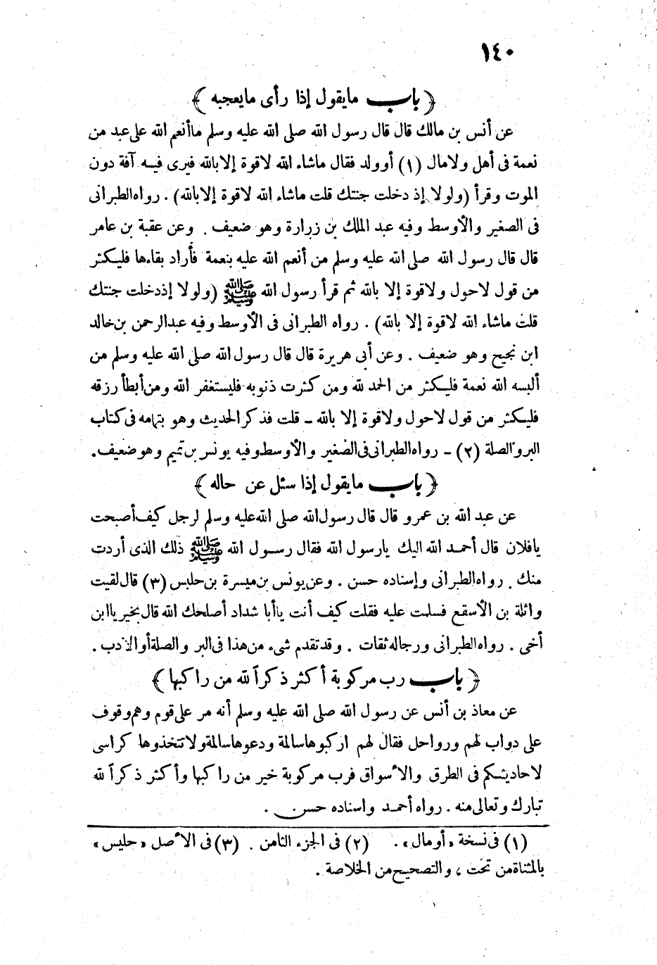 17151 - عَنْ أَنَسِ بْنِ مَالِكٍ قَالَ: قَالَ رَسُولُ اللَّهِ - صَلَّى اللَّهُ عَلَيْهِ وَسَلَّمَ: " «مَا أَنْعَمَ اللَّهُ عَلَى عَبْدٍ مِنْ نِعْمَةٍ فِي أَهْلٍ، وَلَا مَالٍ، أَوْ وَلَدٍ فَقَالَ: مَا شَاءَ اللَّهُ لَا قُوَّةَ إِلَّا بِاللَّهِ، فَيَرَى فِيهِ آفَةً دُونَ الْمَوْتِ ". وَقَرَأَ: {وَلَوْلَا إِذْ دَخَلْتَ جَنَّتَكَ قُلْتَ مَا شَاءَ اللَّهُ لَا قُوَّةَ إِلَّا بِاللَّهِ} [الكهف: 39]»).