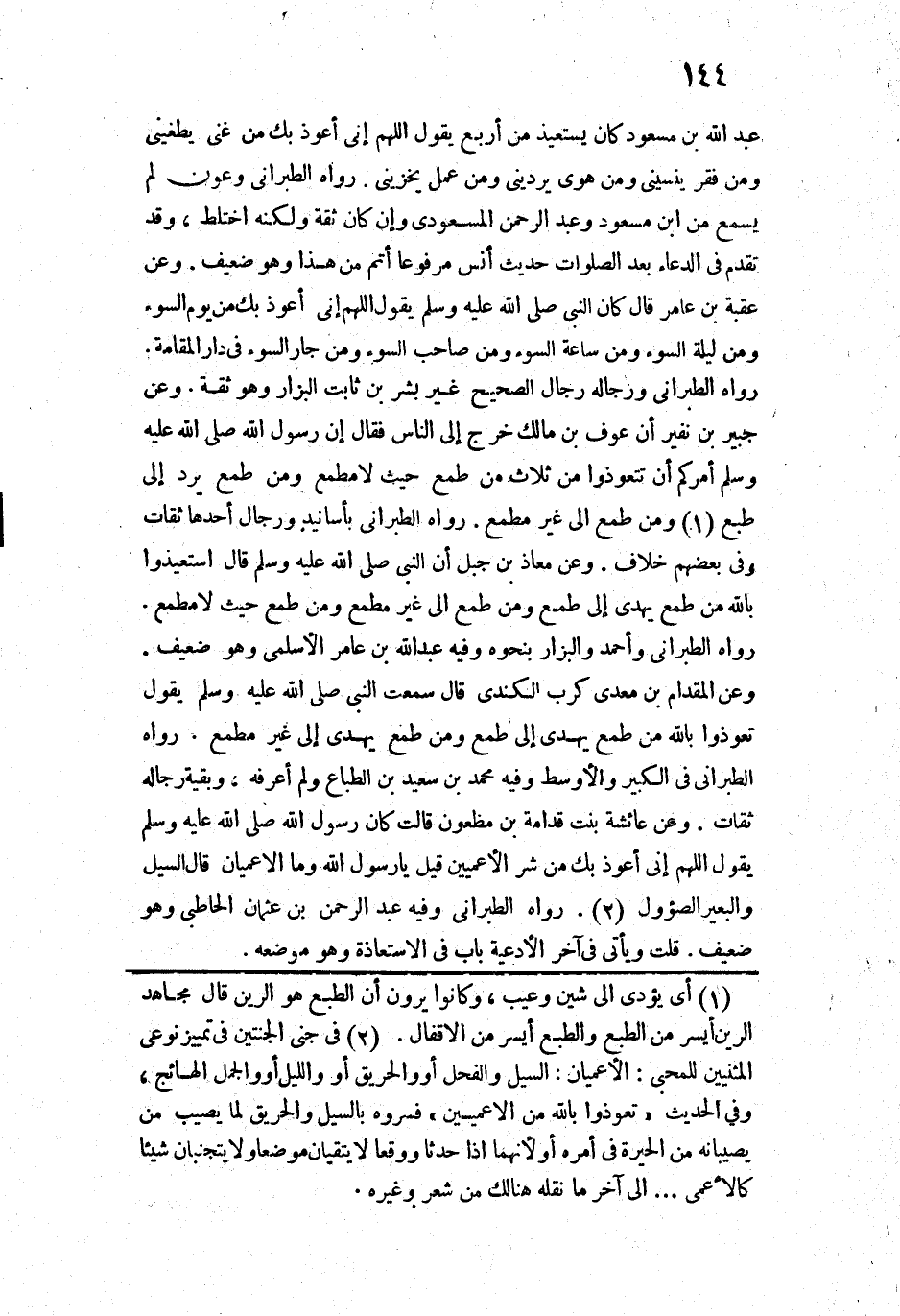 رَوَاهُ الطَّبَرَانِيُّ، وَفِيهِ عَبْدُ الرَّحْمَنِ بْنُ عُثْمَانَ الْحَاطِبِيُّ، وَهُوَ ضَعِيفٌ. قُلْتُ: وَيَأْتِي فِي آخِرِ الْأَدْعِيَةِ بَابٌ فِي الِاسْتِعَاذَةِ، وَهُوَ مَوْضِعُهُ.