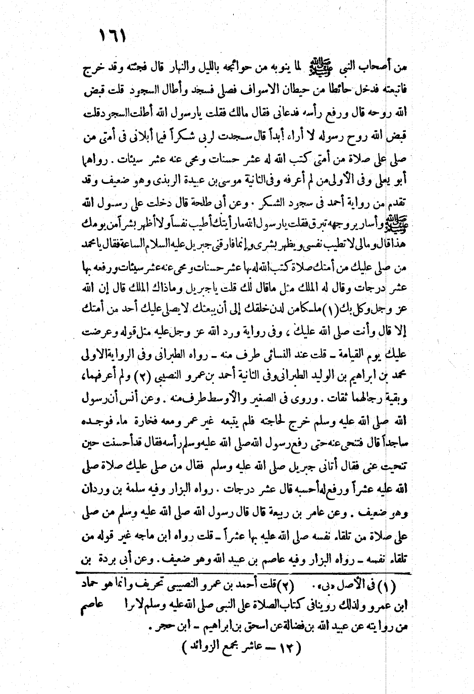 17288 - وَعَنْ أَنَسٍ: «أَنَّ رَسُولَ اللَّهِ - صَلَّى اللَّهُ عَلَيْهِ وَسَلَّمَ - خَرَجَ لِحَاجَتِهِ، فَلَمْ يَتْبَعْهُ غَيْرُ عُمَرَ وَمَعَهُ فَخَّارَةُ مَاءٍ، فَوَجَدَهُ سَاجِدًا قَالَ: فَتَنَحَّى عَنْهُ حَتَّى رَفَعَ رَسُولُ اللَّهِ - صَلَّى اللَّهُ عَلَيْهِ وَسَلَّمَ - رَأْسَهُ، فَقَالَ: " قَدْ أَحْسَنْتَ (يَا عُمَرُ) حِينَ تَنَحَّيْتَ عَنِّي ". فَقَالَ: " أَتَانِي جِبْرِيلُ - صَلَّى اللَّهُ عَلَيْهِ وَسَلَّمَ - فَقَالَ: مَنْ صَلَّى عَلَيْكَ صَلَاةً صَلَّى اللَّهُ عَلَيْهِ عَشْرًا، وَرَفَعَ لَهُ - أَحْسَبُهُ قَالَ: - عَشْرَ دَرَجَاتٍ» ".