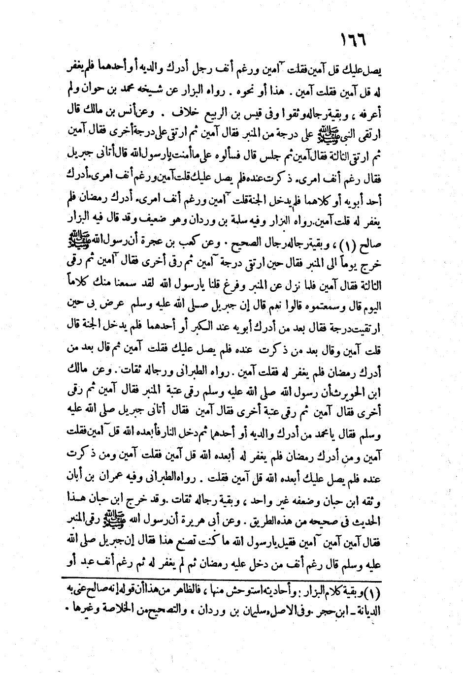 يُصَلِّ عَلَيْكَ، قُلْ: آمِينَ، فَقُلْتُ: آمِينَ. وَرَغِمَ أَنْفُ رَجُلٍ أَدْرَكَ وَالِدَيْهِ أَوْ أَحَدَهُمَا فَلَمْ يُغْفَرْ لَهُ، قُلْ: آمِينَ، فَقُلْتُ: آمِينَ» ". هَذَا أَوْ نَحْوُهُ رَوَاهُ الْبَزَّارُ عَنْ شَيْخِهِ: مُحَمَّدِ بْنِ حَوَانٍ وَلَمْ أَعْرِفْهُ، وَبَقِيَّةُ رِجَالِهِ وُثِّقُوا، وَفِي قَيْسِ بْنِ الرَّبِيعِ خِلَافٌ.