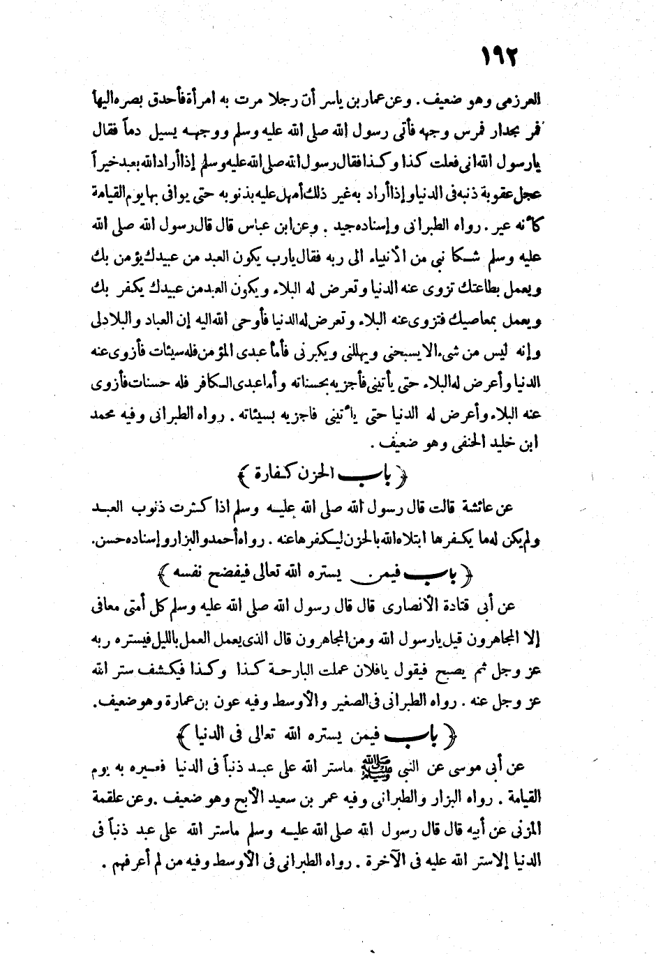 رَوَاهُ الْبَزَّارُ، وَالطَّبَرَانِيُّ، وَفِيهِ عُمَرُ بْنُ سَعِيدٍ الْأَبَحُّ، وَهُوَ ضَعِيفٌ.
