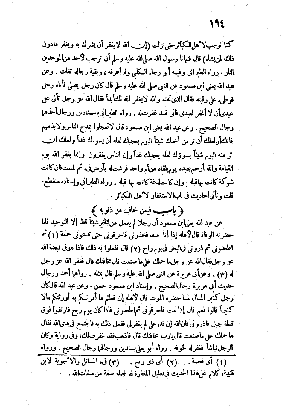 «كُنَّا نُوجِبُ لِأَهْلِ الْكَبَائِرِ حَتَّى نَزَلَتْ: {إِنَّ اللَّهَ لَا يَغْفِرُ أَنْ يُشْرَكَ بِهِ وَيَغْفِرُ مَا دُونَ ذَلِكَ لِمَنْ يَشَاءُ} [النساء: 48] قَالَ: فَنَهَانَا رَسُولُ اللَّهِ - صَلَّى اللَّهُ عَلَيْهِ وَسَلَّمَ - أَنْ نُوجِبَ لِأَحَدٍ مِنَ الْمُوَحِّدِينَ النَّارَ».