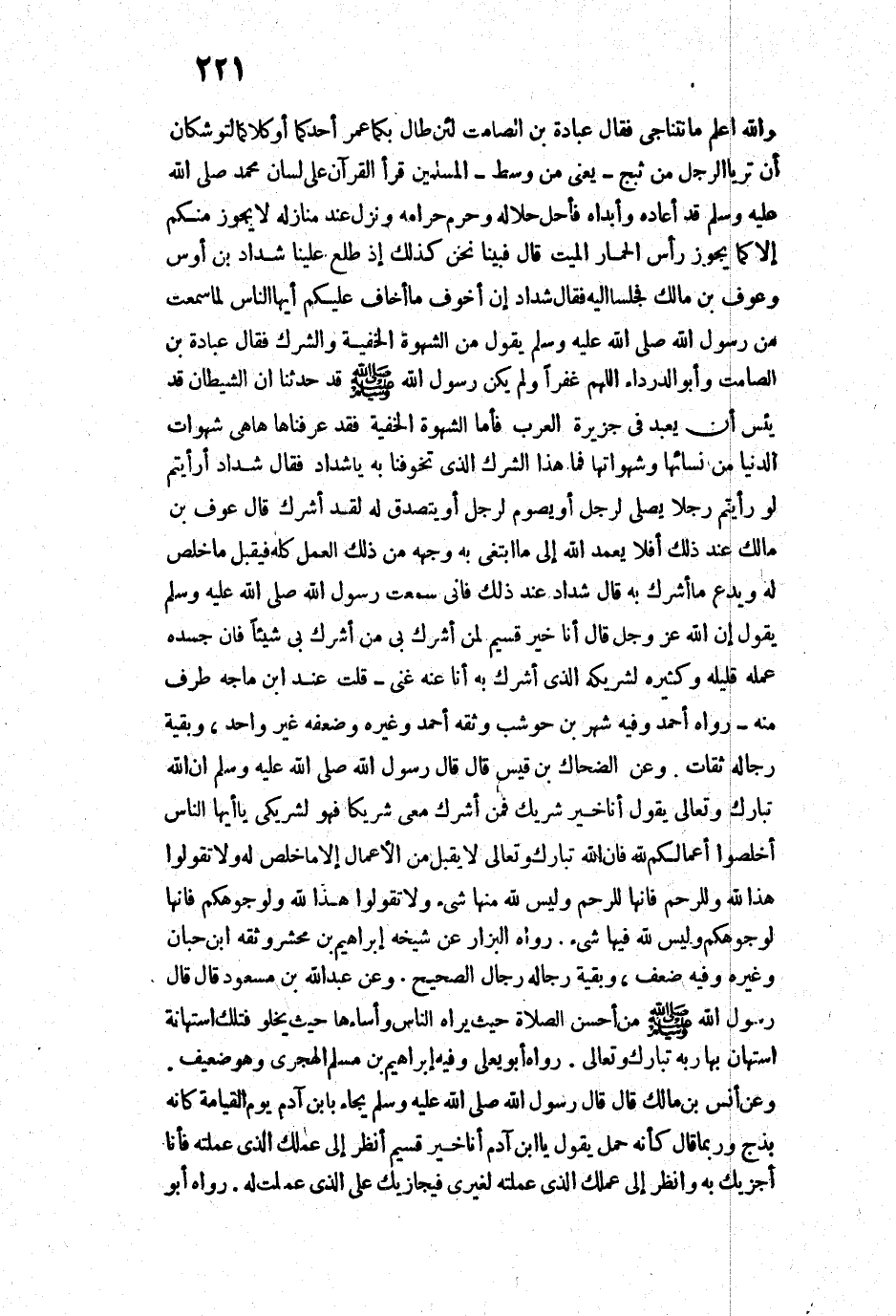 وَاللَّهُ أَعْلَمُ مَا نَتَنَاجَى، فَقَالَ عُبَادَةُ بْنُ الصَّامِتِ: لَئِنْ طَالَ بِكُمَا عُمْرُ أَحَدِكُمَا أَوْ كِلَاكُمَا لَتُوشِكَانِ أَنْ تَرَيَا الرَّجُلَ مَنْ ثَبَجِ - يَعْنِي مِنْ وَسَطِ - الْمُسْلِمِينَ قَرَأَ الْقُرْآنَ عَلَى لِسَانِ مُحَمَّدٍ - صَلَّى اللَّهُ عَلَيْهِ وَسَلَّمَ - قَدْ أَعَادَهُ وَأَبْدَاهُ، فَأَحَلَّ حَلَالَهُ، وَحَرَّمَ حَرَامَهُ، وَنَزَلَ عِنْدَ مَنَازِلِهِ، أَوْ قَرَأَهُ عَلَى لِسَانِ أَخِيهِ قِرَاءَةً عَلَى لِسَانِ مُحَمَّدٍ صَلَّى اللَّهُ عَلَيْهِ وَسَلَّمَ فَأَعَادَهُ وَأَبْدَاهُ، وَأَحَلَّ حَلَالَهُ، وَحَرَّمَ حَرَامَهُ، وَنَزَلَ عِنْدَ مَنَازِلَهُ، لَا يَحُوزُ فِيكُمْ إِلَّا كَمَا يَحُوزُ رَأْسُ الْحِمَارِ الْمَيِّتِ، قَالَ: فَبَيْنَا نَحْنُ كَذَلِكَ إِذْ طَلَعَ عَلَيْنَا شَدَّادُ بْنُ أَوْسٍ، وَعَوْفُ بْنُ مَالِكٍ، فَجَلَسَا إِلَيْهِ. فَقَالَ شَدَّادٌ: إِنَّ أَخْوَفَ مَا أَخَافُ عَلَيْكُمْ أَيُّهَا النَّاسُ، لَمَا سَمِعْتُ مِنْ رَسُولِ اللَّهِ - صَلَّى اللَّهُ عَلَيْهِ وَسَلَّمَ - يَقُولُ: " مِنَ الشَّهْوَةِ الْخَفِيَّةِ وَالشِّرْكِ ". فَقَالَ عُبَادَةُ بْنُ الصَّامِتِ، وَأَبُو الدَّرْدَاءِ: اللَّهُمَّ غَفْرًا، أَوَ لَمْ يَكُنْ رَسُولُ اللَّهِ - صَلَّى اللَّهُ عَلَيْهِ وَسَلَّمَ - قَدْ حَدَّثَنَا: " أَنَّ الشَّيْطَانَ قَدْ يَئِسَ أَنْ يُعْبَدَ فِي جَزِيرَةِ الْعَرَبِ؟!. فَأَمَّا الشَّهْوَةُ الْخَفِيَّةُ فَقَدْ عَرَفْنَاهَا، هَا هِيَ شَهَوَاتُ الدُّنْيَا مِنْ نِسَائِهَا وَشَهَوَاتُهَا، فَمَا هَذَا الشِّرْكُ الَّذِي تُخَوِّفُنَا بِهِ يَا شَدَّادُ؟! فَقَالَ شَدَّادُ: أَرَأَيْتُمْ لَوْ رَأَيْتُمْ أَنَّ رَجُلًا يُصَلِّي لِرَجُلٍ، أَوْ يَصُومُ لِرَجُلٍ، أَوْ يَتَصَدَّقُ لَهُ، أَتَرَوْنَ أَنَّهُ قَدْ أَشْرَكَ؟ قَالُوا: نَعَمْ وَاللَّهِ، إِنَّهُ مَنْ صَلَّى لِرَجُلٍ أَوْ صَامَ لَهُ أَوْ تَصَدَّقَ لَهُ لَقَدْ أَشْرَكَ. فَقَالَ شَدَّادٌ: فَإِنِّي قَدْ سَمِعْتُ رَسُولَ اللَّهِ صَلَّى اللَّهُ عَلَيْهِ وَسَلَّمَ يَقُولُ: مَنْ صَلَّى يُرَائِي فَقَدْ أَشْرَكَ، وَمَنْ صَامَ يُرَائِي فَقَدْ أَشْرَكَ، وَمَنْ تَصَدَّقَ يُرَائِي فَقَدْ أَشْرَكَ. فَقَالَ عَوْفُ بْنُ مَالِكٍ عِنْدَ ذَلِكَ: أَفَلَا يَعْمِدُ اللَّهُ إِلَى مَا ابْتُغِيَ بِهِ وَجْهُهُ مِنْ ذَلِكَ الْعَمَلِ كُلِّهِ فَيَقْبَلُ مَا خَلَصَ لَهُ، وَيَدَعُ مَا أُشْرِكَ بِهِ؟! قَالَ شَدَّادٌ عِنْدَ ذَلِكَ: فَإِنِّي سَمِعْتُ رَسُولَ اللَّهِ - صَلَّى اللَّهُ عَلَيْهِ وَسَلَّمَ - يَقُولُ: " إِنَّ اللَّهَ - عَزَّ وَجَلَّ - قَالَ: أَنَا خَيْرُ قَسِيمٍ لِمَنْ أَشْرَكَ بِي، مَنْ أَشْرَكَ بِي شَيْئًا ; فَإِنَّ حَشْدَهُ عَمَلَهُ قَلِيلَهُ وَكَثِيرَهُ لِشَرِيكِهِ الَّذِي أَشْرَكَ بِهِ، أَنَا عَنْهُ غَنِيٌّ». قُلْتُ: عِنْدَ ابْنِ مَاجَهْ طَرَفٌ مِنْهُ.