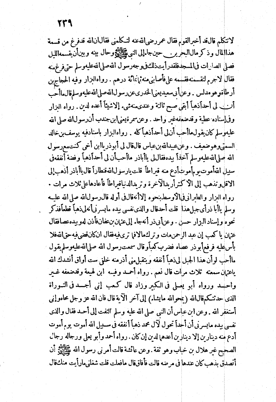 لَا تَتَكَلَّمُ؟ قَالَ: قَدْ أَخْبَرَ الْقَوْمُ، فَقَالَ عُمَرُ - رَضِيَ اللَّهُ عَنْهُ -: لَتُكَلِّمُنِي. فَقَالَ: إِنَّ اللَّهَ قَدْ فَرَغَ مِنْ قِسْمَةِ هَذَا الْمَالِ، وَذَكَرَ حَدِيثَ مَالِ الْبَحْرَيْنِ حِينَ جَاءَ إِلَى النَّبِيِّ - صَلَّى اللَّهُ عَلَيْهِ وَسَلَّمَ - وَحَالَ بَيْنَهُ وَبَيْنَ أَنْ يُقَسِّمَهُ اللَّيْلَ، فَصَلَّى الصَّلَوَاتِ فِي الْمَسْجِدِ، فَلَقَدْ رَأَيْتُ ذَلِكَ فِي وَجْهِ رَسُولِ اللَّهِ - صَلَّى اللَّهُ عَلَيْهِ وَسَلَّمَ - حَتَّى فَرَغَ مِنْهُ، فَقَالَ: لَا جَرَمَ لَتُقَسِّمَنَّهُ ; فَقَسَّمَهُ عَلِيٌّ فَأَصَابَنِي مِنْهُ ثَمَانُمِائَةِ دِرْهَمٍ».