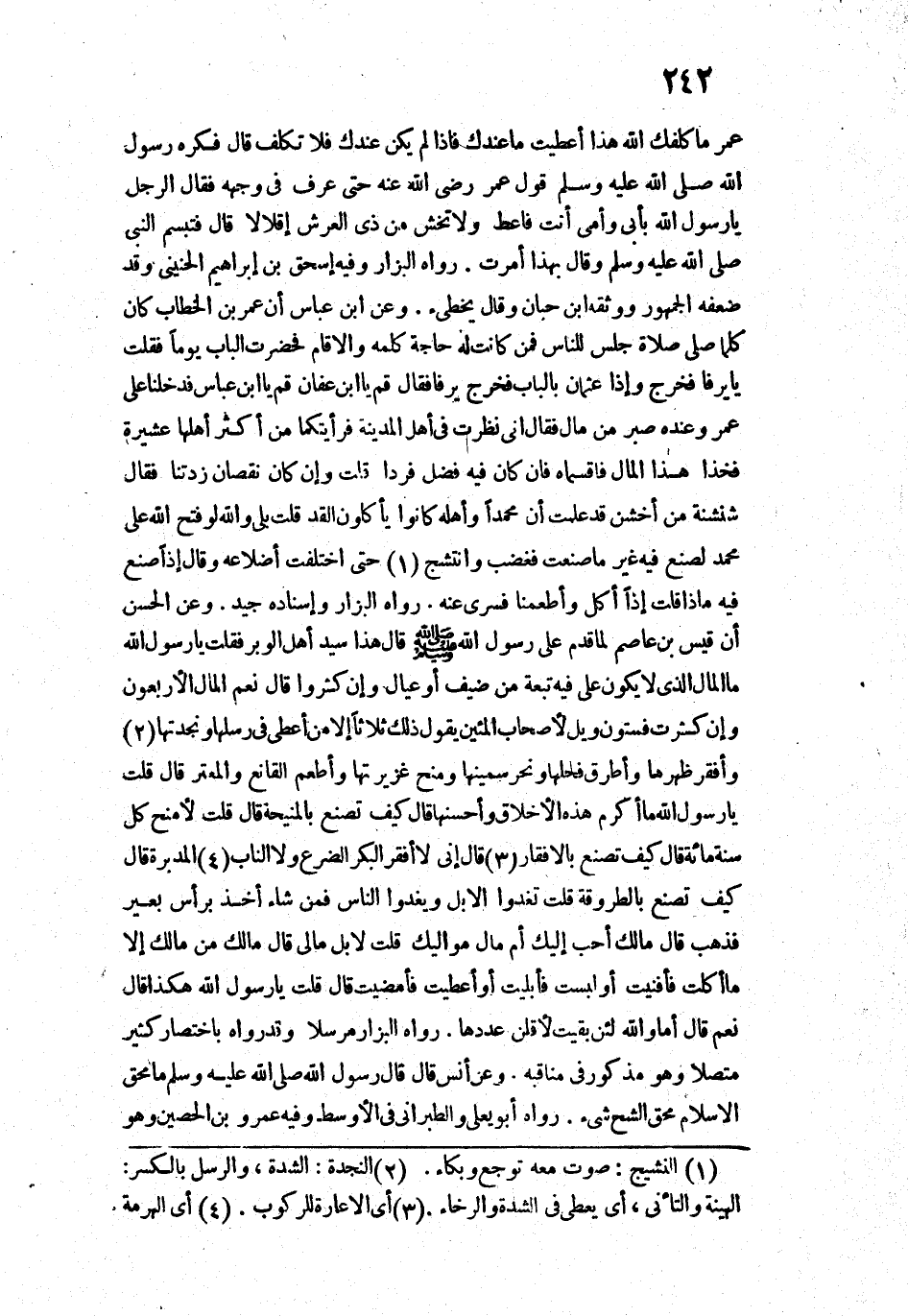 عُمَرُ: مَا كَلَّفَكَ اللَّهُ هَذَا، أَعْطَيْتَ مَا عِنْدَكَ، فَإِذَا لَمْ يَكُنْ عِنْدَكَ فَلَا تُكَلَّفُ، قَالَ: فَكَرِهَ رَسُولُ اللَّهِ - صَلَّى اللَّهُ عَلَيْهِ وَسَلَّمَ - قَوْلَ عُمَرَ - رَضِيَ اللَّهُ عَنْهُ - حَتَّى عُرِفَ فِي وَجْهِهِ. فَقَالَ الرَّجُلُ: يَا رَسُولَ اللَّهِ، بِأَبِي وَأُمِّي أَنْتَ، فَأَعْطِ وَلَا تَخْشَ مِنْ ذِي الْعَرْشِ إِقْلَالًا. قَالَ: فَتَبَسَّمَ النَّبِيُّ - صَلَّى اللَّهُ عَلَيْهِ وَسَلَّمَ - وَقَالَ: " بِهَذَا أُمِرْتُ».