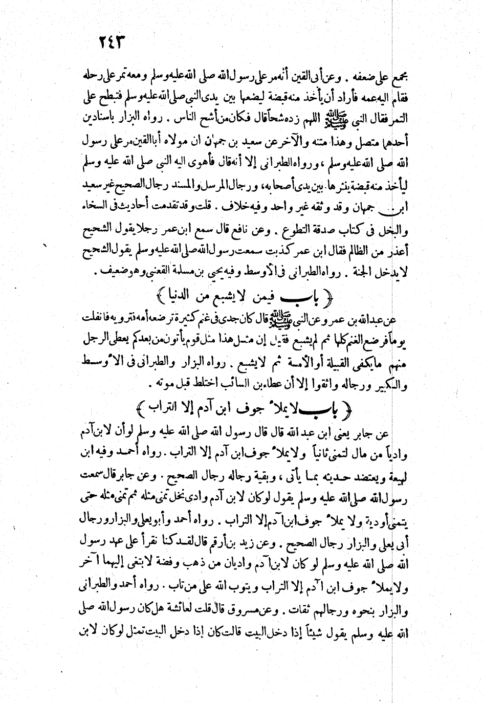17786 - عَنْ جَابِرٍ - يَعْنِي ابْنَ عَبْدِ اللَّهِ - قَالَ: قَالَ رَسُولُ اللَّهِ - صَلَّى اللَّهُ عَلَيْهِ وَسَلَّمَ -: «لَوْ أَنَّ لِابْنِ آدَمَ وَادِيًا مِنْ مَالٍ لَتَمَنَّى وَادِيَيْنِ وَلَوْ أَنَّ لَهُ وَادِيَيْنِ لَتَمَنَّى ثَالِثًا، وَلَا يَمْلَأُ جَوْفَ ابْنِ آدَمَ إِلَّا التُّرَابَ».