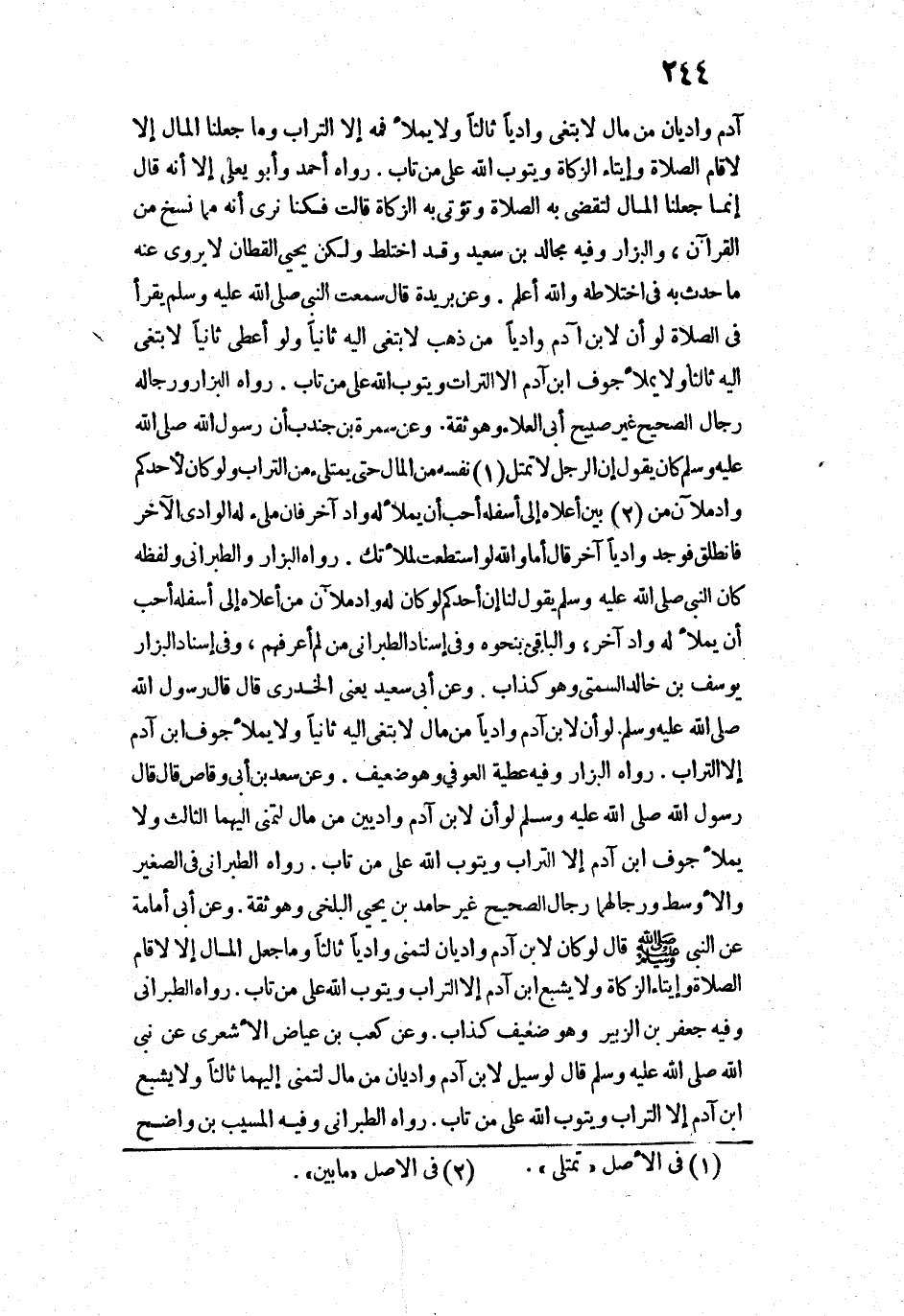 آدَمَ وَادِيَانِ مِنْ مَالٍ لَابْتَغَى وَادِيًا ثَالِثًا، وَلَا يَمْلَأُ فَمَهُ إِلَّا التُّرَابُ، وَمَا جَعَلْنَا الْمَالَ إِلَّا لِإِقَامِ الصَّلَاةِ، وَإِيتَاءِ الزَّكَاةِ، وَيَتُوبُ اللَّهُ عَلَى مَنْ تَابَ».