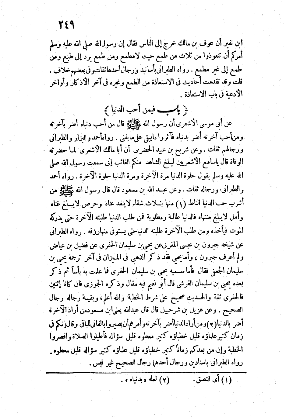 بْنِ نُفَيْرٍ: «أَنَّ عَوْفَ بْنَ مَالِكٍ خَرَجَ إِلَى النَّاسِ فَقَالَ: إِنَّ رَسُولَ اللَّهِ - صَلَّى اللَّهُ عَلَيْهِ وَسَلَّمَ - أَمَرَكُمْ أَنْ تَتَعَوَّذُوا مِنْ ثَلَاثٍ: مِنْ طَمَعٍ حَيْثُ لَا مَطْمَعَ، وَمِنْ طَمَعٍ يَهْدِي إِلَى طَبْعٍ، وَمَنْ طَمِعَ إِلَى غَيْرِ مَطْمَعٍ».