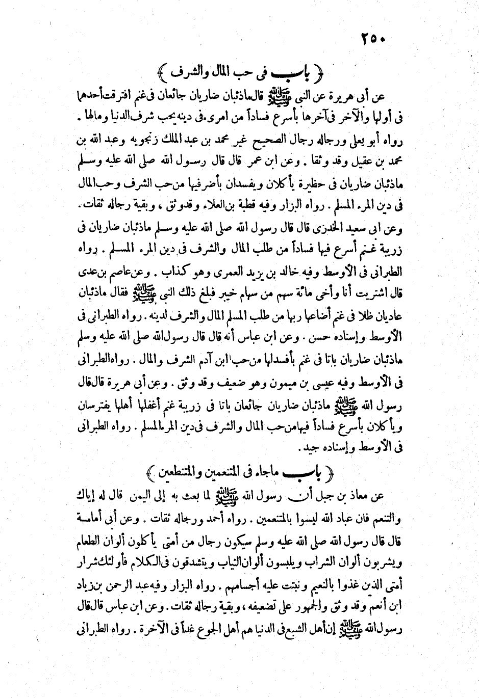 17833 - وَعَنِ ابْنِ عَبَّاسٍ أَنَّهُ قَالَ: قَالَ رَسُولُ اللَّهِ - صَلَّى اللَّهُ عَلَيْهِ وَسَلَّمَ -: «مَا ذِئْبَانِ ضَارِيَانِ بَاتَا فِي غَنَمٍ بِأَفْسَدَ لَهَا مِنْ حُبِّ ابْنِ آدَمَ الشَّرَفَ وَالْمَالَ».