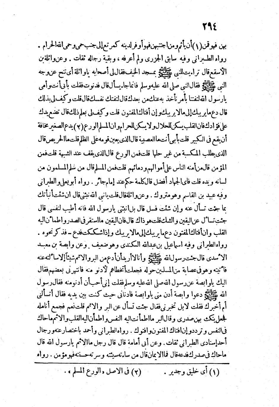 18115 - وَعَنْ وَاثِلَةَ بْنِ الْأَسْقَعِ قَالَ: «تَرَاءَيْتُ لِلنَّبِيِّ - صَلَّى اللَّهُ عَلَيْهِ وَسَلَّمَ - بِمَسْجِدِ الْخَيْفِ، فَقَالَ لِي أَصْحَابُهُ: إِلَيْكِ يَا وَاثِلَةُ، أَيْ تَنَحَّ عَنْ وَجْهِ النَّبِيِّ - صَلَّى اللَّهُ عَلَيْهِ وَسَلَّمَ -. فَقَالَ النَّبِيُّ - صَلَّى اللَّهُ عَلَيْهِ وَسَلَّمَ -: " دَعُوهُ فَإِنَّمَا جَاءَ يَسْأَلُ ". قَالَ: فَدَنَوْتُ، فَقُلْتُ: بِأَبِي أَنْتَ وَأُمِّي يَا رَسُولَ اللَّهِ، لِتُفْتِنَا مِنْ أَمْرٍ نَأْخُذُ بِهِ عَنْكَ مِنْ بَعْدِكَ، قَالَ: " لِتُفْتِكَ نَفْسُكَ ". قَالَ: قُلْتُ: وَكَيْفَ لِي بِذَلِكَ؟! قَالَ: " دَعْ مَا يَرِيبُكَ إِلَى مَا لَا يَرِيبُكَ، وَإِنْ أَفْتَاكَ الْمُفْتُونُ ". قُلْتُ: وَكَيْفَ لِي بِعِلْمِ ذَلِكَ؟ قَالَ: " تَضَعُ يَدَكَ عَلَى فُؤَادِكَ ; فَإِنَّ الْقَلْبَ يَسْكُنُ لِلْحَلَّالِ، وَلَا يَسْكُنُ لِلْحَرَامِ، وَإِنَّ الْوَرِعَ الْمُسْلِمَ يَدَعُ الصَّغِيرَ مَخَافَةَ أَنْ يَقَعَ فِي الْكَبِيرِ ". قُلْتُ: بِأَبِي أَنْتَ مَا الْعَصَبِيَّةُ؟ قَالَ: " الَّذِي يُعِينُ قَوْمَهُ عَلَى الظُّلْمِ ". قُلْتُ: فَمَنِ الْحَرِيصُ؟ قَالَ: " الَّذِي يَطْلُبُ الْمَكْسَبَةَ مِنْ غَيْرِ حِلِّهَا ". قُلْتُ: فَمَنَ الْوَرِعُ؟ قَالَ: " الَّذِي يَقِفُ عِنْدَ الشُّبْهَةِ ". قُلْتُ: فَمَنِ الْمُؤْمِنُ؟ قَالَ: " مَنْ أَمِنَهُ النَّاسُ عَلَى أَمْوَالِهِمْ وَدِمَائِهِمْ ". قُلْتُ: فَمَنِ الْمُسْلِمُ؟ قَالَ: " مَنْ سَلِمَ الْمُسْلِمُونَ مِنْ لِسَانِهِ وَيَدِهِ ". قُلْتُ: فَأَيُّ الْجِهَادِ أَفْضَلُ؟ قَالَ: " كَلِمَةُ حُكْمٍ عِنْدَ إِمَامٍ جَائِرٍ» ".